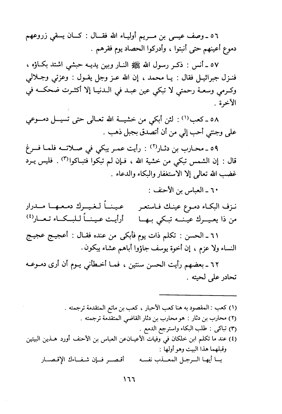 58- كعب «1» : لئن أبكي من خشية الله تعالى حتى تسيل دموعي على وجنتي أحب إلي من أن أتصدق بجبل ذهب.