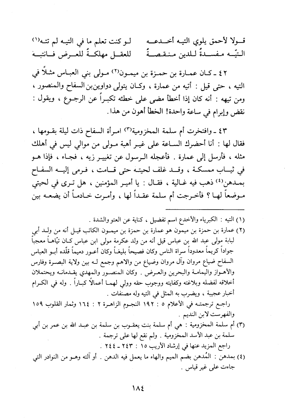 42- كان عمارة بن حمزة بن ميمون «2» مولى بني العباس مثلا في التيه، حتى قيل: أتيه من عمارة، وكان يتولى دواوين بن السفاح والمنصور، ومن تيهه: أنه كان إذا أخطأ مضى على خطئه تكبرا عن الرجوع، ويقول: