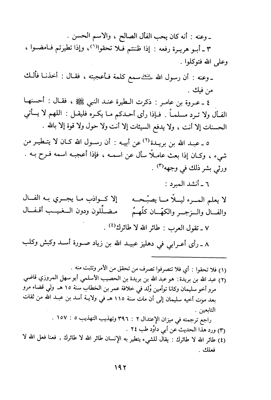 4- عروة بن عامر: ذكرت الطيرة عند النبي صلّى الله عليه وسلّم، فقال: أحسنها الفأل ولا ترد مسلما. فإذا رأى أحدكم ما يكره فليقل: اللهم لا يأتي الحسنات إلا أنت، ولا يدفع السيئات إلا أنت ولا حول ولا قوة إلا بالله.