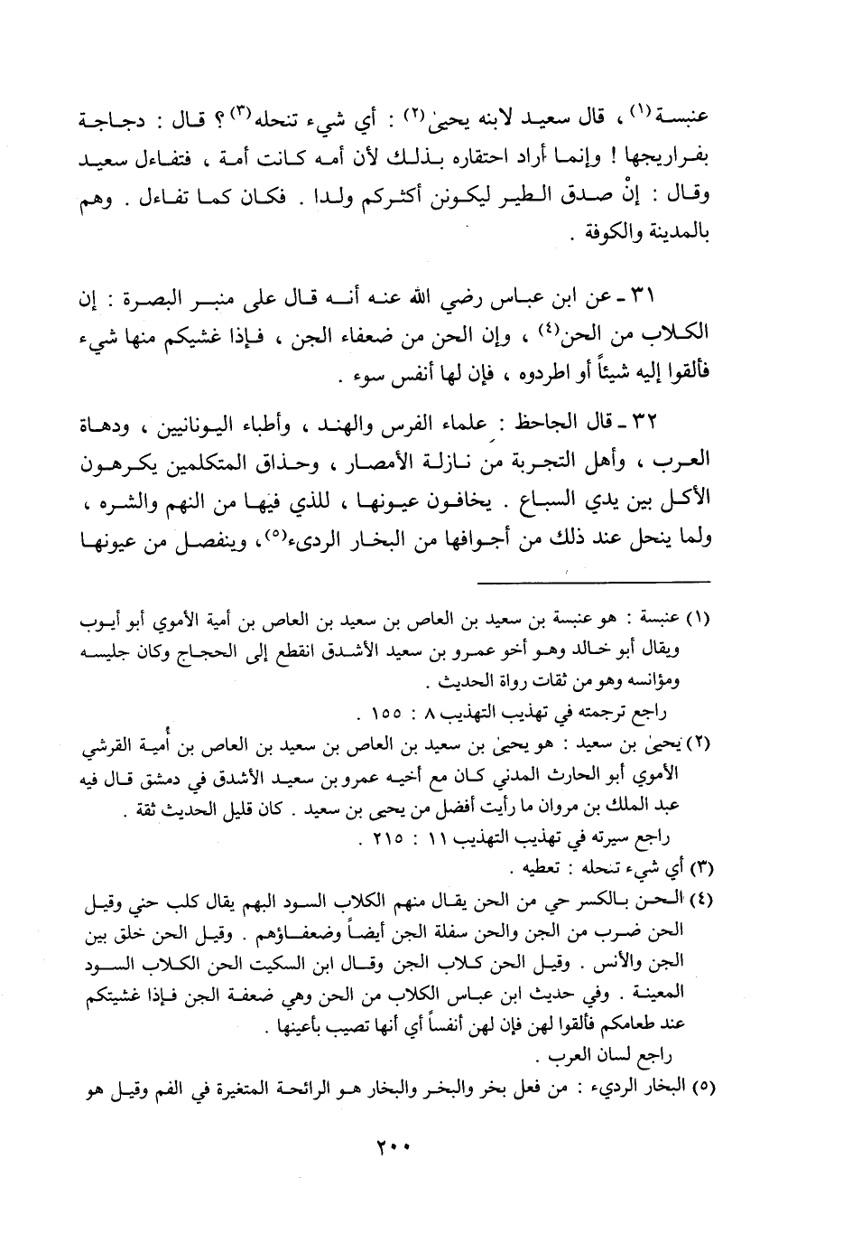 31- عن ابن عباس رضي الله عنه أنه قال على منبر البصرة: إن الكلاب من الحن «4» ، وإن الحن من ضعفاء الجن، فإذا غشيكم منها شيء فألقوا إليه شيئا أو اطردوه، فإن لها أنفس سوء.