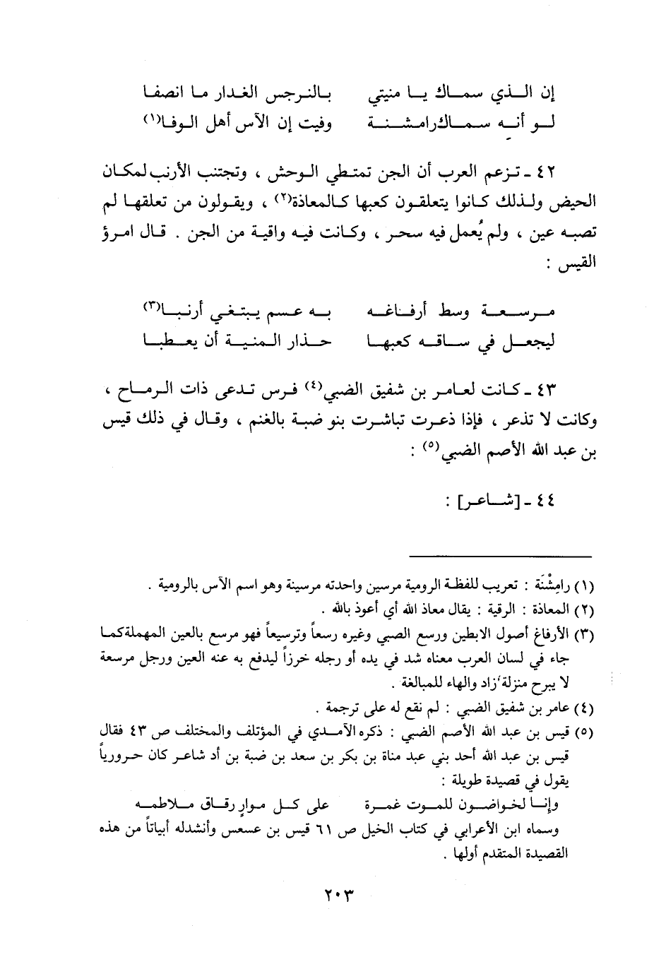 43- كانت لعامر بن شفيق الضبي «4» فرس تدعى ذات الرماح، وكانت لا تذعر، فإذا ذعرت تباشرت بنو ضبة بالغنم، وقال في ذلك قيس بن عبد الله الأصم الضبي «5» :