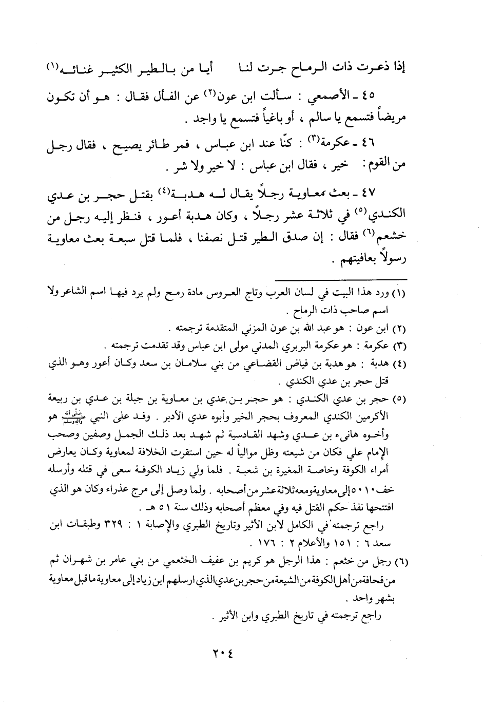 47- بعث معاوية رجلا يقال له هدبة «4» بقتل حجر بن عدي الكندي «5» في ثلاثة عشر رجلا، وكان هدبة أعور، فنظر إليه رجل من خشعم «6» فقال: إن صدق الطير قتل نصفنا، فلما قتل سبعة بعث معاوية رسولا بعافيتهم.