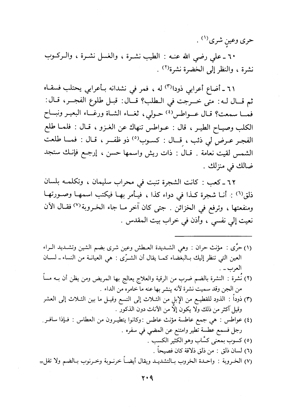 62- كعب: كانت الشجرة تنبت في محراب سليمان، وتكلمه بلسان ذلق «6» : أنا شجرة كذا في دواء كذا، فيأمر بها فيكتب اسمها وصورتها ومنفعتها، وترفع في الخزائن. حتى كان آخر ما جاء الخروبة «7» فقال الآن نعيت إلي نفسي، وأذن في خراب بيت المقدس.