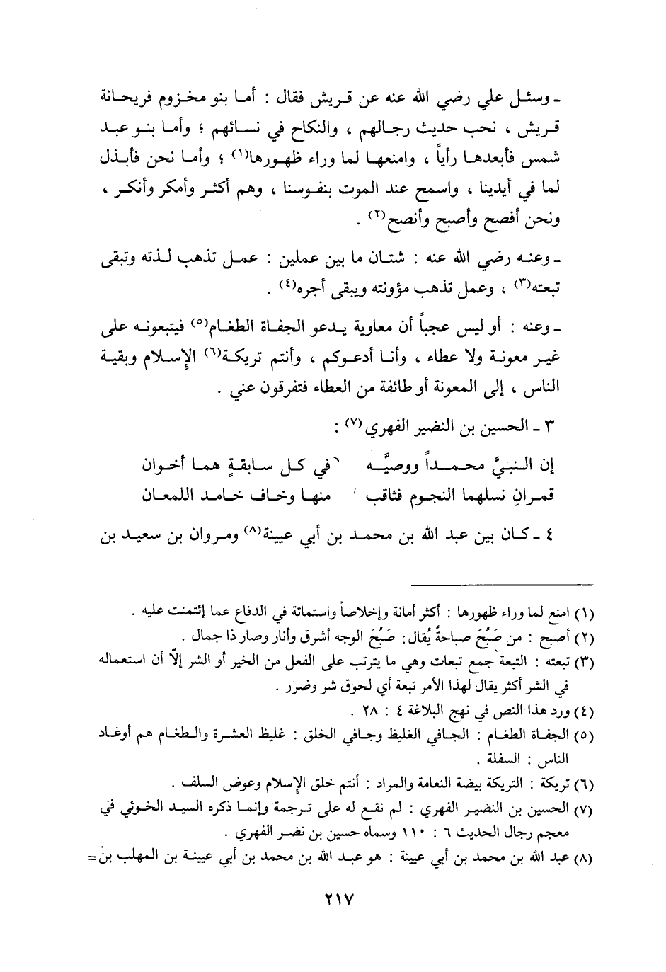 - وعنه: أوليس عجبا أن معاوية يدعو الجفاة الطغام «5» فيتبعونه على غير معونة ولا عطاء، وأنا أدعوكم، وأنتم تريكة «6» الإسلام وبقية الناس، إلى المعونة أو طائفة من العطاء فتفرقون عني.