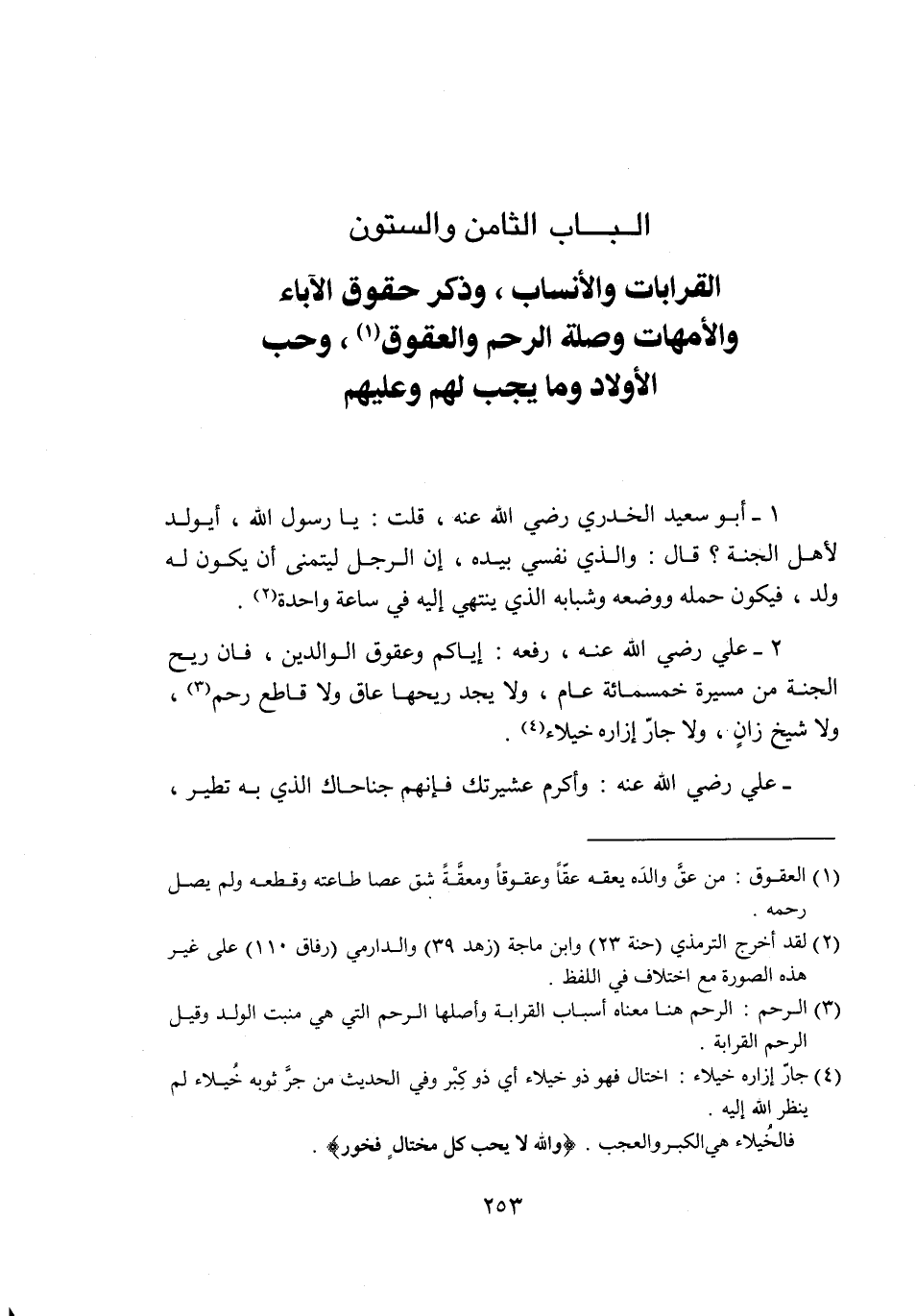 الباب الثامن والستون القرابات والأنساب، وذكر حقوق الآباء والأمهات وصلة الرحم والعقوق «1» ، وحب الأولاد وما يجب لهم وعليهم