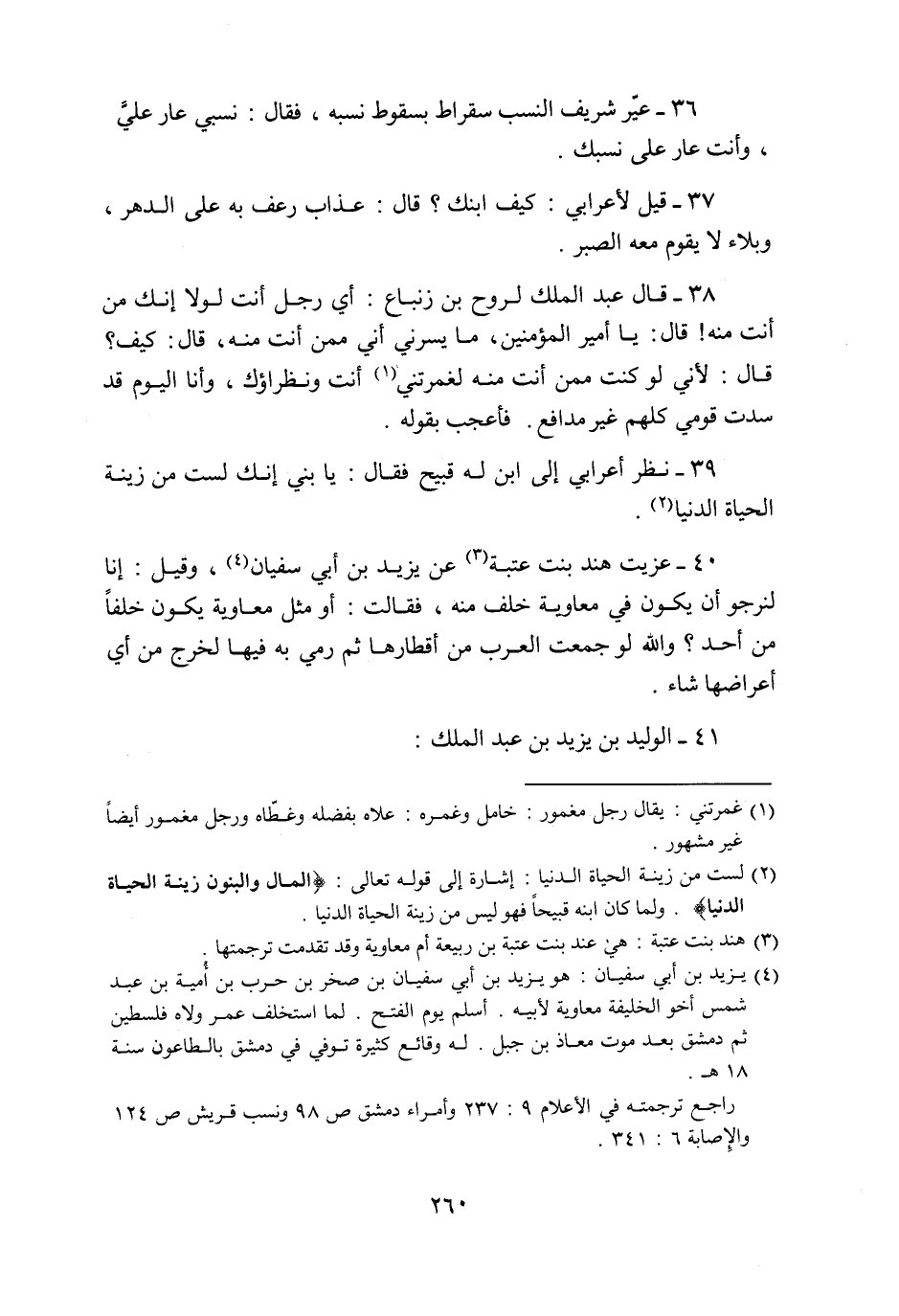 38- قال عبد الملك لروح بن زنباع: أي رجل أنت لولا إنك من أنت منه! قال: يا أمير المؤمنين، ما يسرني أني ممن أنت منه، قال: كيف؟