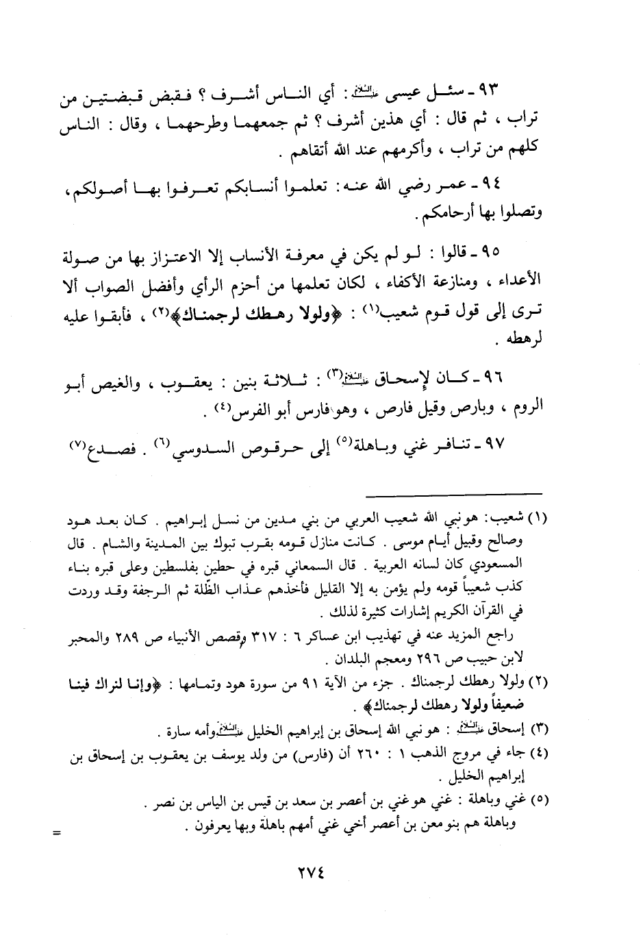 95- قالوا: لو لم يكن في معرفة الأنساب إلا الاعتزاز بها من صولة الأعداء، ومنازعة الأكفاء، لكان تعلمها من أحزم الرأي وأفضل الصواب ألا ترى إلى قول قوم شعيب «1» : وَلَوْلا رَهْطُكَ لَرَجَمْناكَ