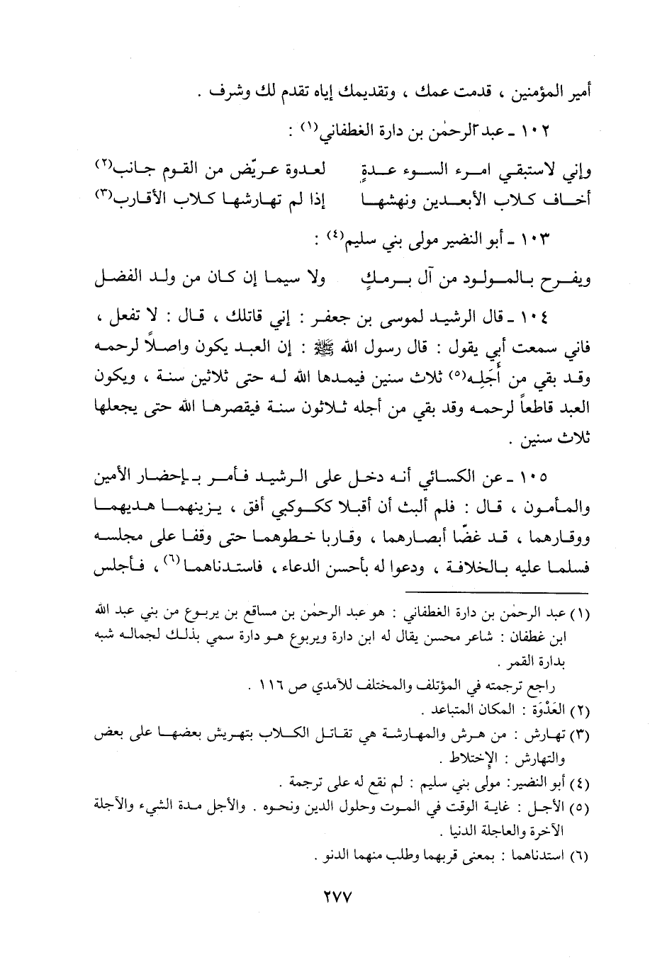 104- قال الرشيد لموسى بن جعفر: إني قاتلك، قال: لا تفعل، فاني سمعت أبي يقول: قال رسول الله صلّى الله عليه وسلّم: إن العبد يكون واصلا لرحمه وقد بقي من أجله «5» ثلاث سنين فيمدها الله له حتى ثلاثين سنة، ويكون العبد قاطعا لرحمه وقد بقي من أجله ثلاثون سنة فيقصرها الله حتى يجعلها ثلاث سنين.