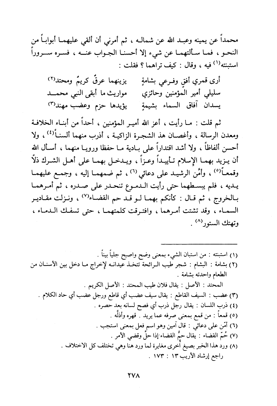 ثم قلت: ما رأيت، أعز الله أمير المؤمنين، أحدا من أبناء الخلافة ومعدن الرسالة، وأغصان هذ الشجرة الزاكية، أذرب منهما ألسنا «4» ، ولا أحسن ألفاظا، ولا أشد اقتدارا على بادية ما حفظا ورويا منهما، أسأل الله أن يزيد بهما الإسلام تأييدا وعزا، ويدخل بهما على أهل الشرك ذلا وقمعا «5» ، وأمّن الرشيد على دعائي «6» ، ثم ضمهما إليه، وجمع عليهما يديه، فلم يبسطهما حتى رأيت الدموع تنحدر على صدره، ثم أمرهما بالخروج، ثم قال: كأنكم بهما لو قد حم القضاء «7» ، ونزلت مقادير السماء، وقد تشتت أمرهما، وافترقت كلمتهما، حتى تسفك الدماء، وتهتك الستور «8» .