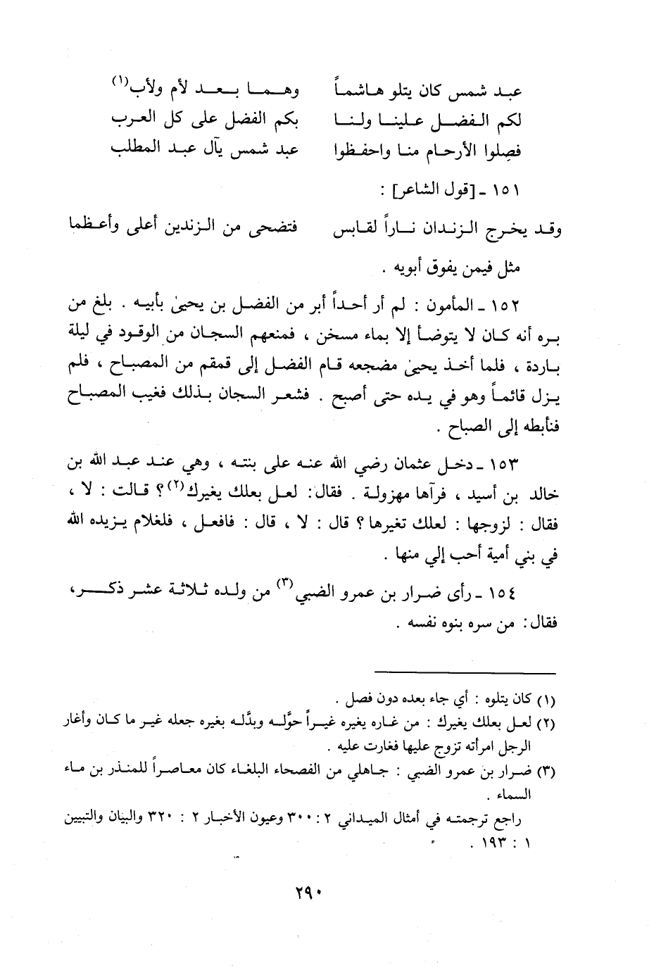 152- المأمون: لم أر أحدا أبر من الفضل بن يحيى بأبيه. بلغ من بره أنه كان لا يتوضأ إلا بماء مسخن، فمنعهم السجان من الوقود في ليلة باردة، فلما أخذ يحيى مضجعه قام الفضل إلى قمقم من المصباح، فلم يزل قائما وهو في يده حتى أصبح. فشعر السجان بذلك فغيب المصباح فنأبطه إلى الصباح.