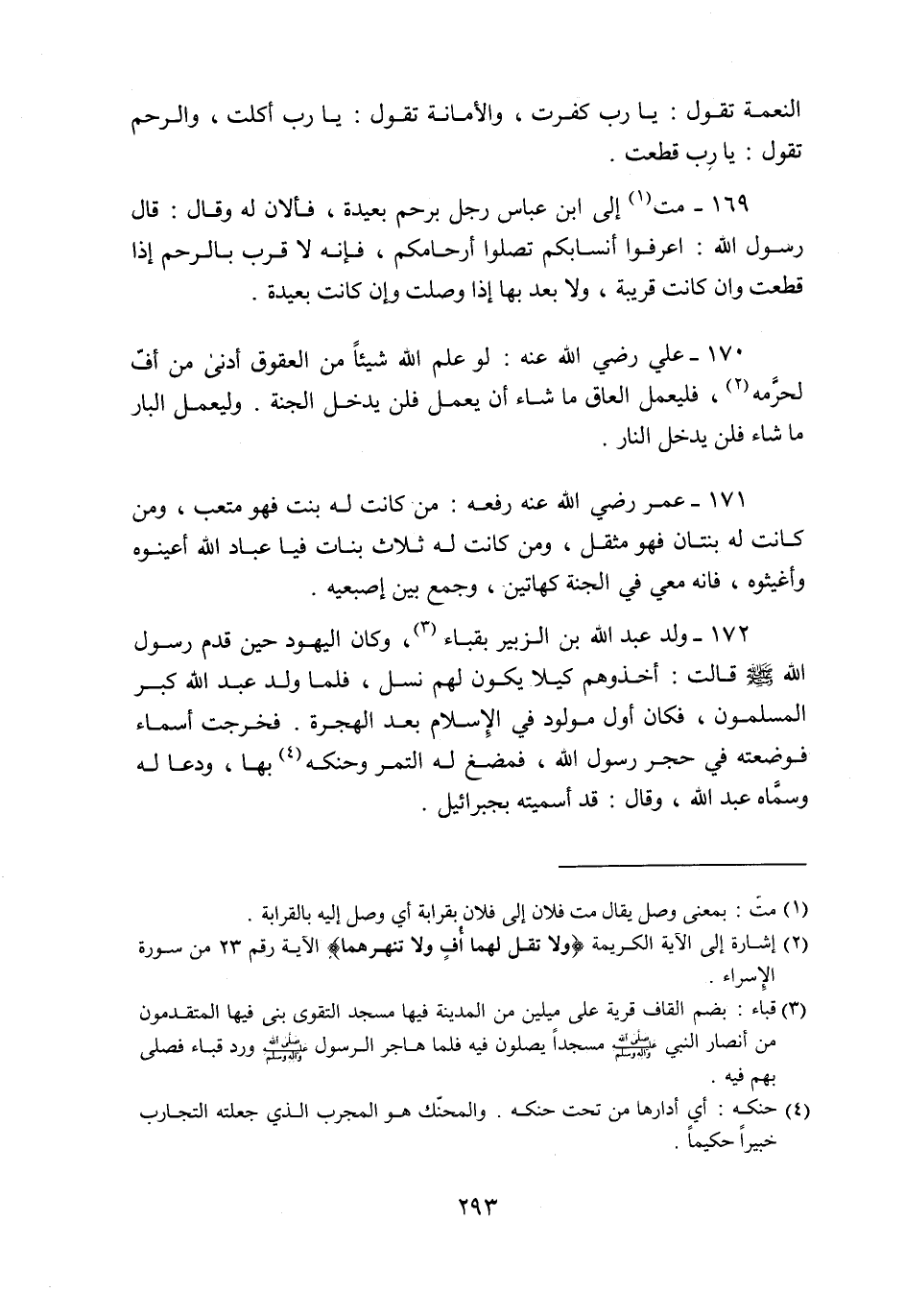 169- مت «1» إلى ابن عباس رجل برحم بعيدة، فألان له وقال: قال رسول الله: اعرفوا أنسابكم تصلوا أرحامكم، فإنه لا قرب بالرحم إذا قطعت وان كانت قريبة، ولا بعد بها إذا وصلت وإن كانت بعيدة.