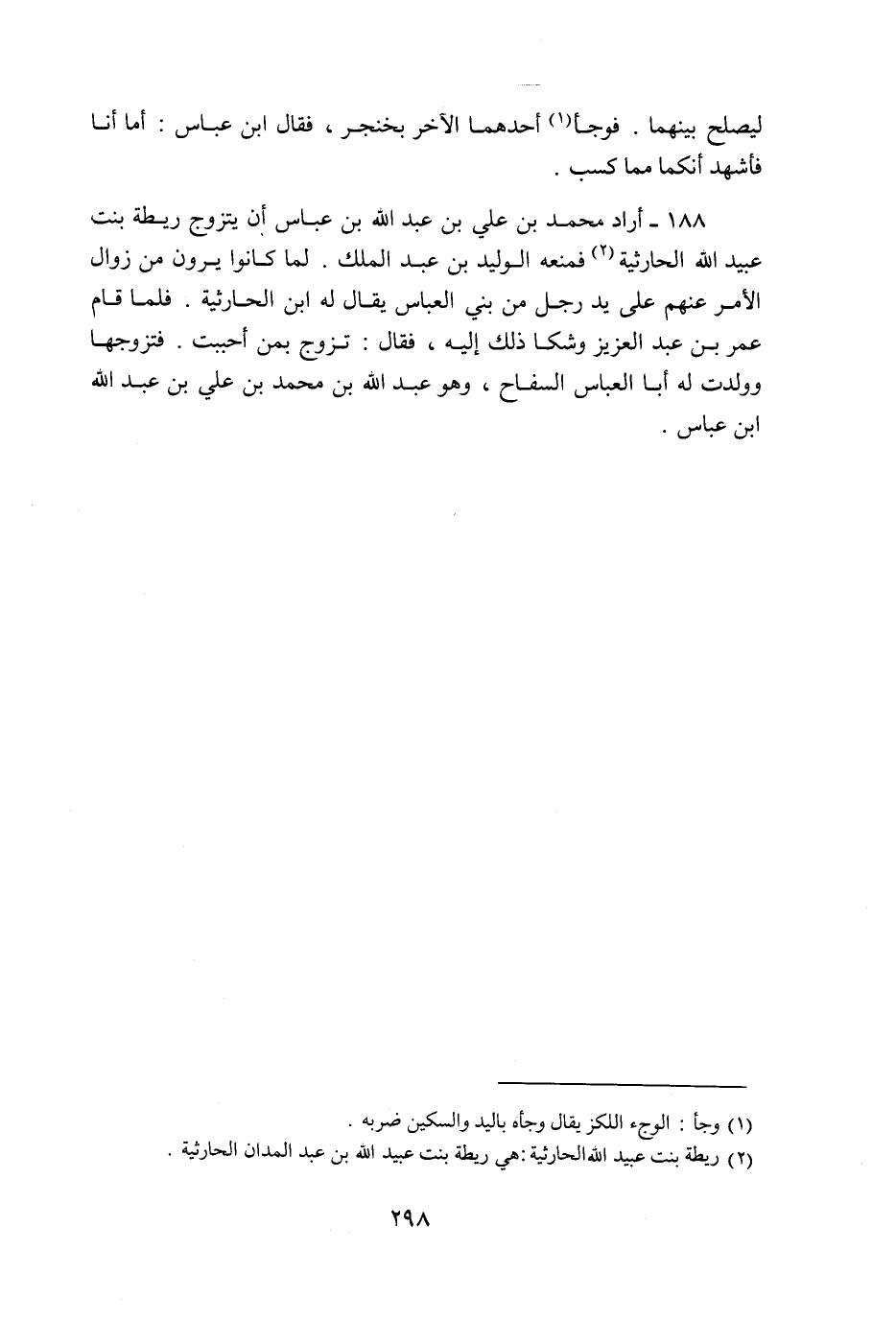 188- أراد محمد بن علي بن عبد الله بن عباس أن يتزوج ريطة بنت عبيد الله الحارثية «2» فمنعه الوليد بن عبد الملك. لما كانوا يرون من زوال الأمر عنهم على يد رجل من بني العباس يقال له ابن الحارثية. فلما قام عمر بن عبد العزيز وشكا ذلك إليه، فقال: تزوج بمن أحببت. فتزوجها وولدت له أبا العباس السفاح، وهو عبد الله بن محمد بن علي بن عبد الله ابن عباس.