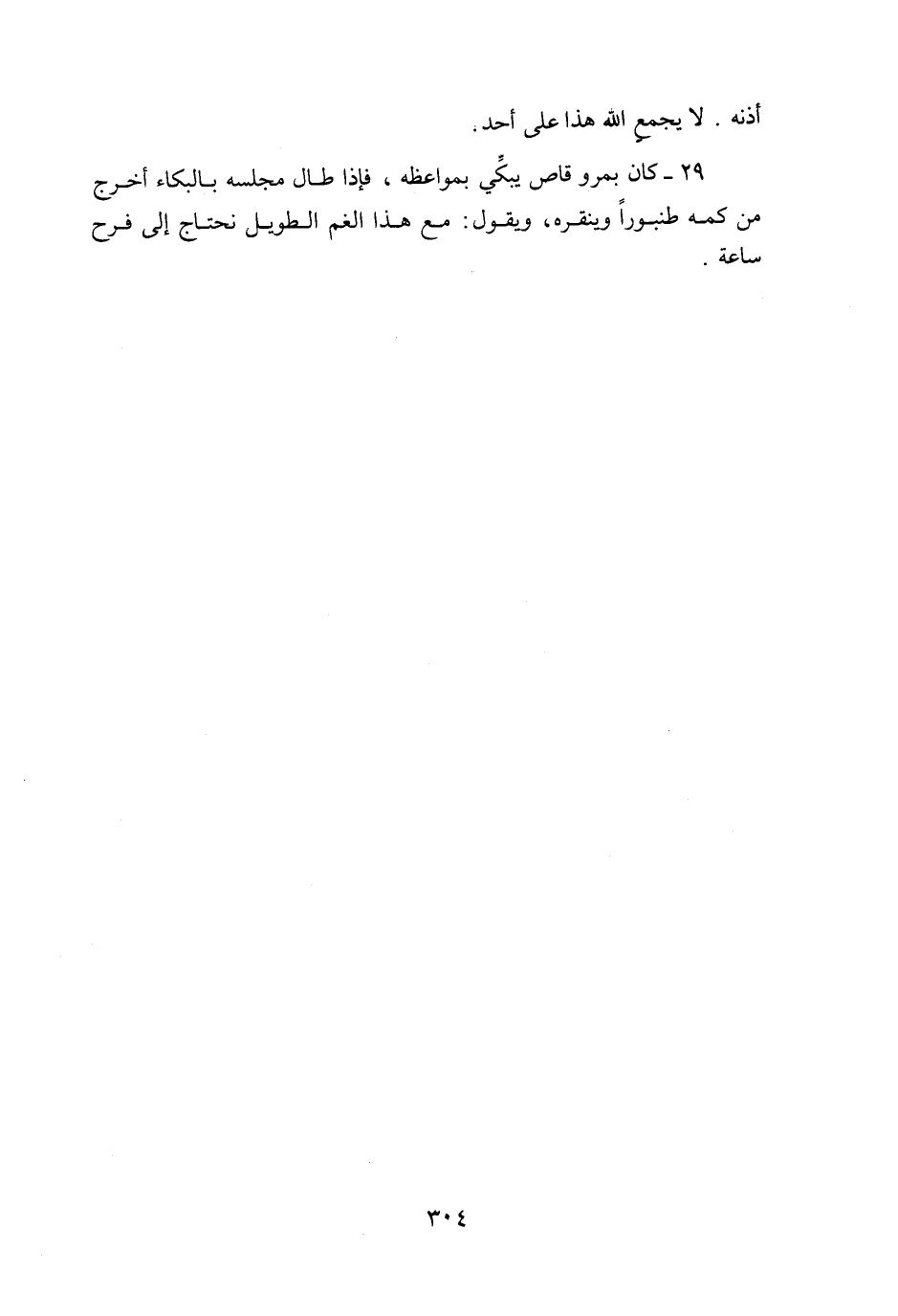 29- كان بمرو قاص يبكّي بمواعظه، فإذا طال مجلسه بالبكاء أخرج من كمه طنبورا وينقره، ويقول: مع هذا الغم الطويل نحتاج إلى فرح ساعة.