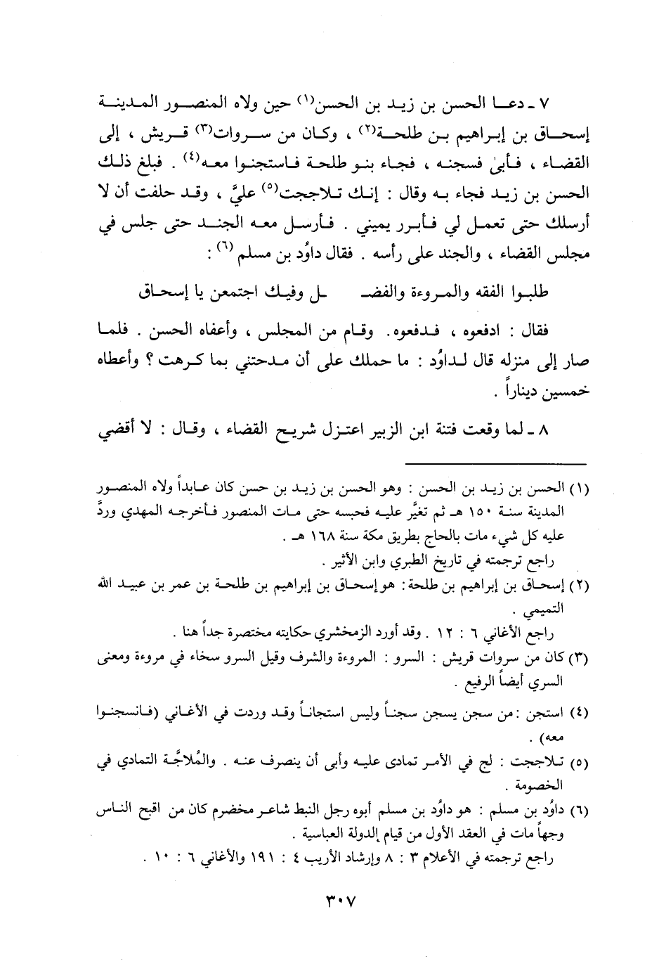 7- دعا الحسن بن زيد بن الحسن «1» حين ولاه المنصور المدينة إسحاق بن إبراهيم بن طلحة «2» ، وكان من سروات «3» قريش، إلى القضاء، فأبى فسجنه، فجاء بنو طلحة فاستجنوا معه «4» . فبلغ ذلك الحسن بن زيد فجاء به وقال: إنك تلاججت «5» عليّ، وقد حلفت أن لا أرسلك حتى تعمل لي فأبرر يميني. فأرسل معه الجند حتى جلس في مجلس القضاء، والجند على رأسه. فقال داود بن مسلم «6» :