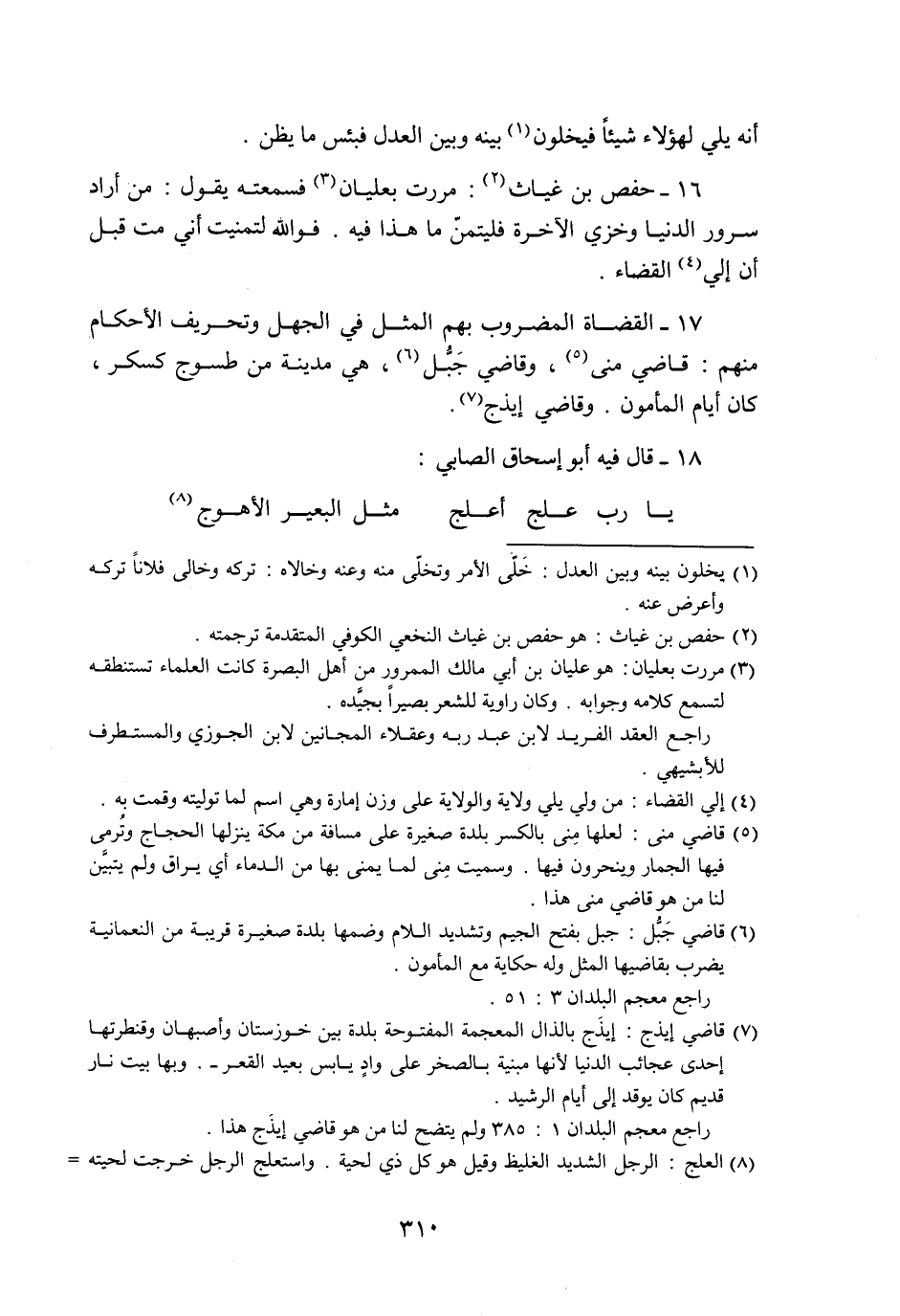 17- القضاة المضروب بهم المثل في الجهل وتحريف الأحكام منهم: قاضي منى «5» ، وقاضي جبّل «6» ، هي مدينة من طسوج كسكر، كان أيام المأمون. وقاضي إيذج «7» .