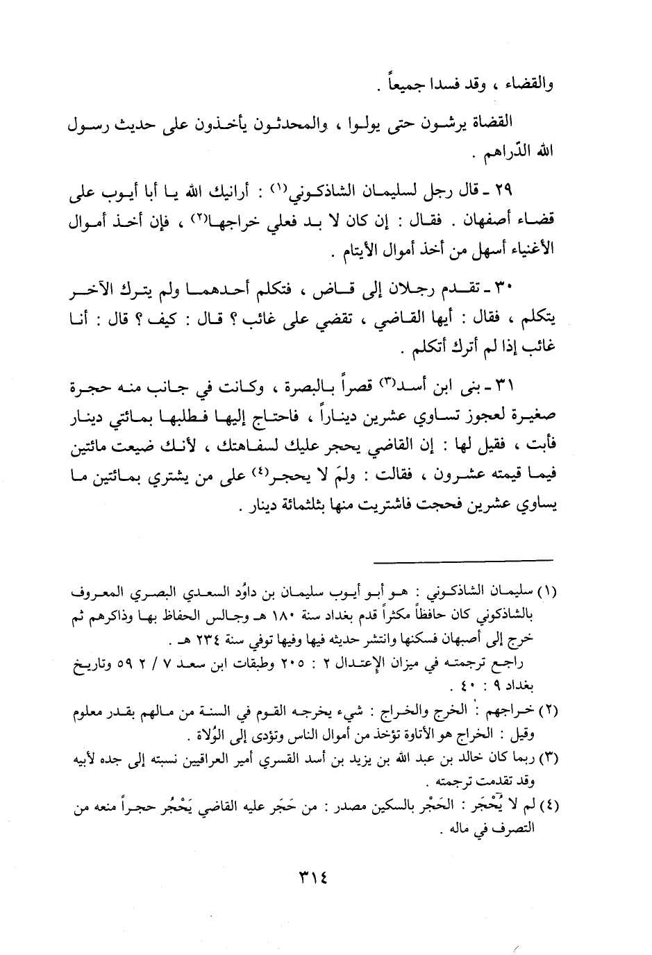 29- قال رجل لسليمان الشاذكوني «1» : أرانيك الله يا أبا أيوب على قضاء أصفهان. فقال: إن كان لا بد فعلي خراجها «2» ، فإن أخذ أموال الأغنياء أسهل من أخذ أموال الأيتام.