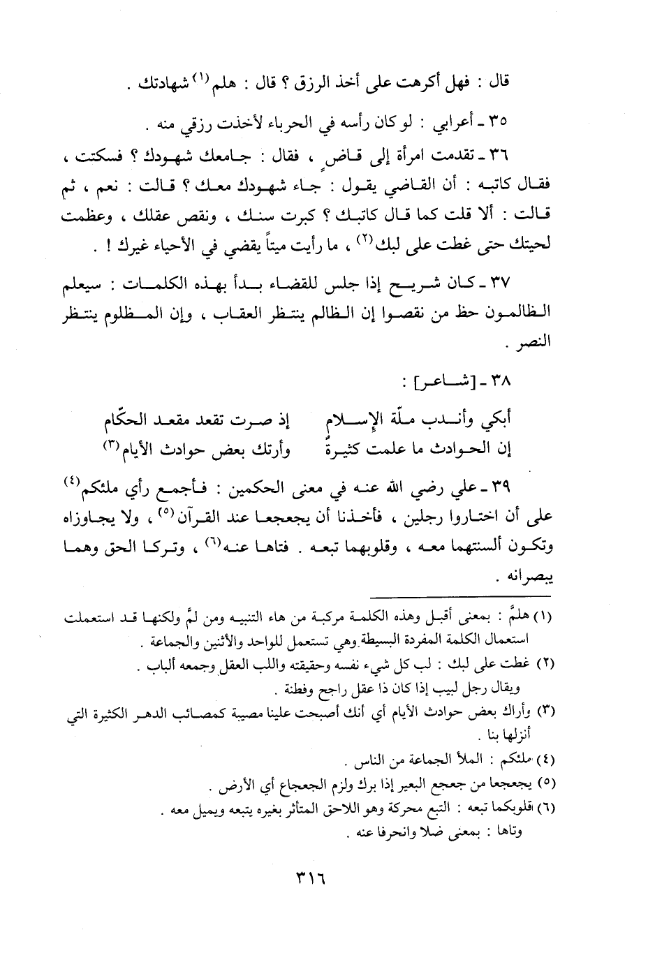 37- كان شريح إذا جلس للقضاء بدأ بهذه الكلمات: سيعلم الظالمون حظ من نقصوا إن الظالم ينتظر العقاب، وإن المظلوم ينتظر النصر.
