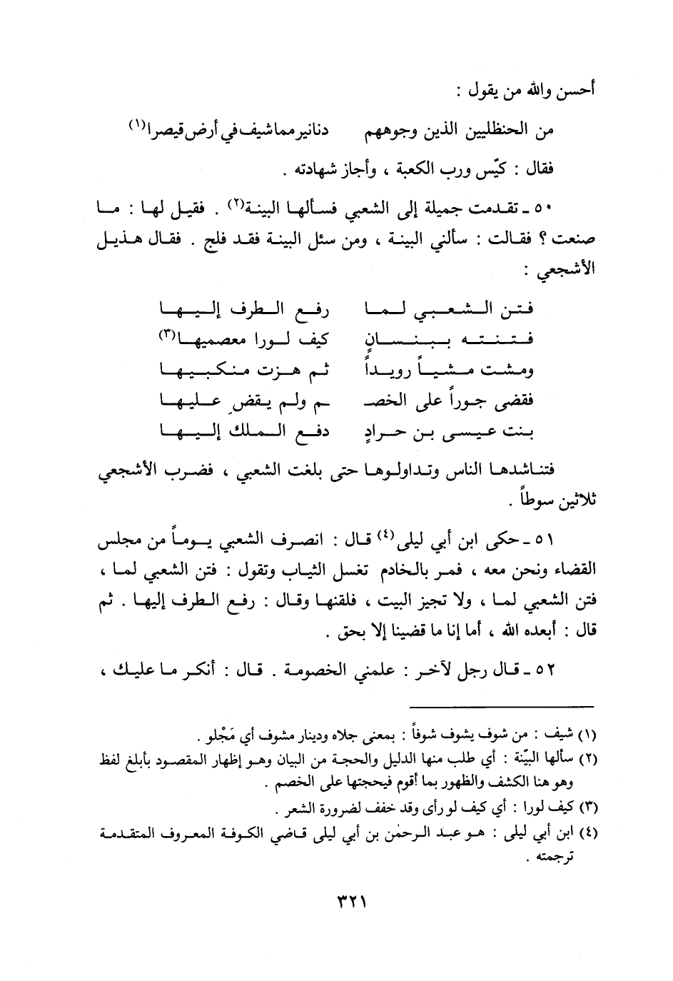 50- تقدمت جميلة إلى الشعبي فسألها البينة «2» . فقيل لها: ما صنعت؟ فقالت: سألني البينة، ومن سئل البينة فقد فلج. فقال هذيل الأشجعي:
