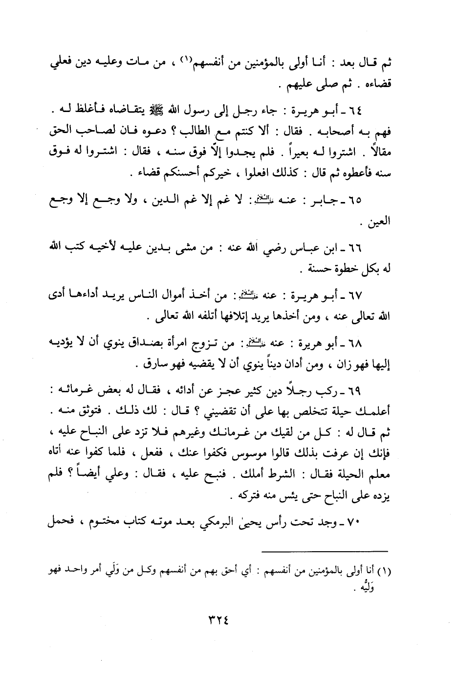 67- أبو هريرة: عنه عليه السّلام: من أخذ أموال الناس يريد أداءها أدى الله تعالى عنه، ومن أخذها يريد إتلافها أتلفه الله تعالى.