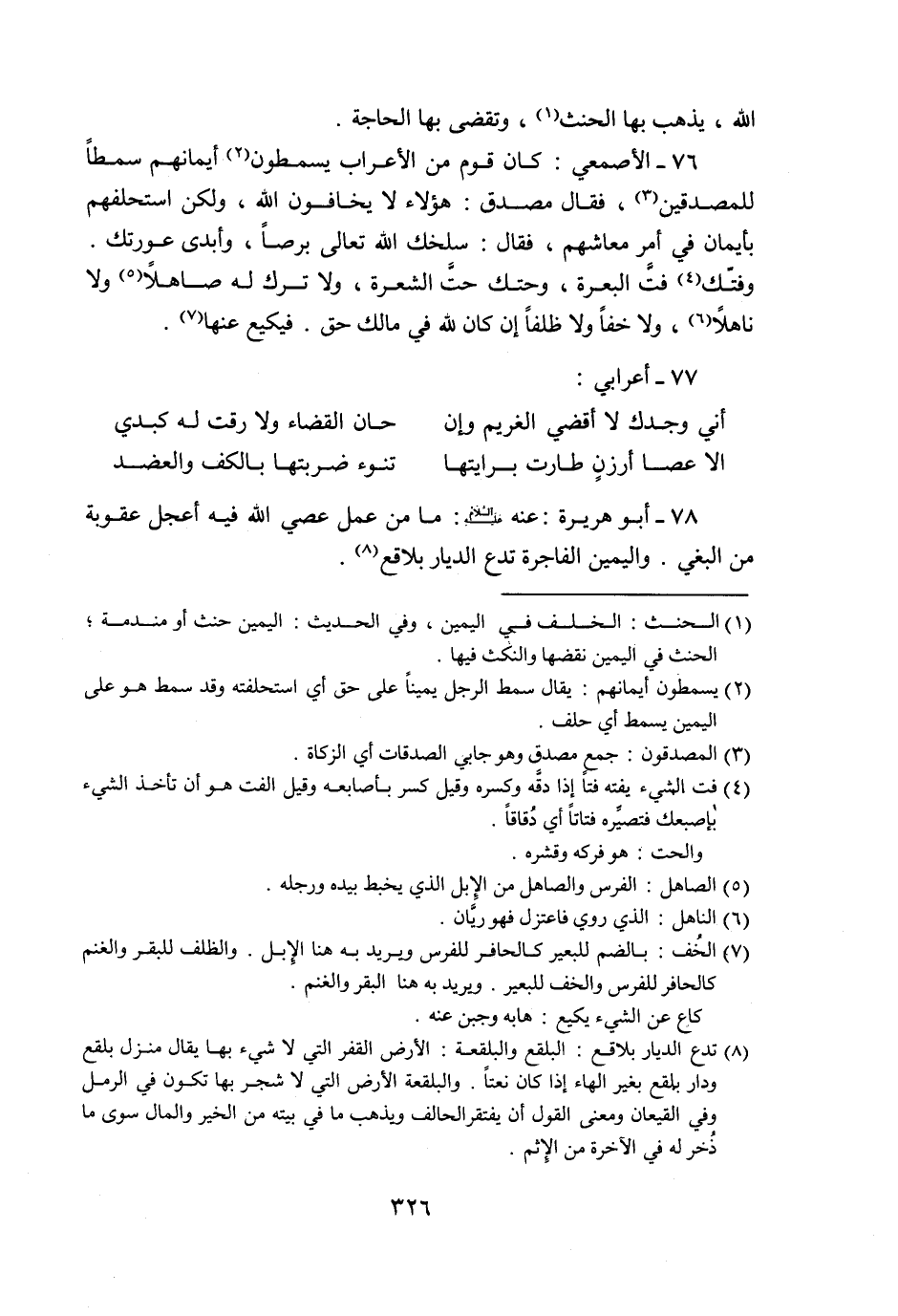 76- الأصمعي: كان قوم من الأعراب يسمطون «2» أيمانهم سمطا للمصدقين «3» ، فقال مصدق: هؤلاء لا يخافون الله، ولكن استحلفهم بأيمان في أمر معاشهم، فقال: سلخك الله تعالى برصا، وأبدى عورتك.