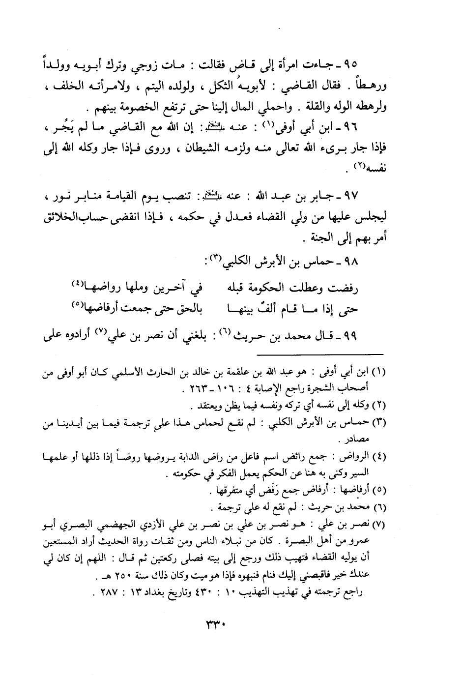 96- ابن أبي أوفى «1» : عنه عليه السّلام: إن الله مع القاضي ما لم يجر، فإذا جار برىء الله تعالى منه ولزمه الشيطان، وروى فإذا جار وكله الله إلى نفسه «2» .