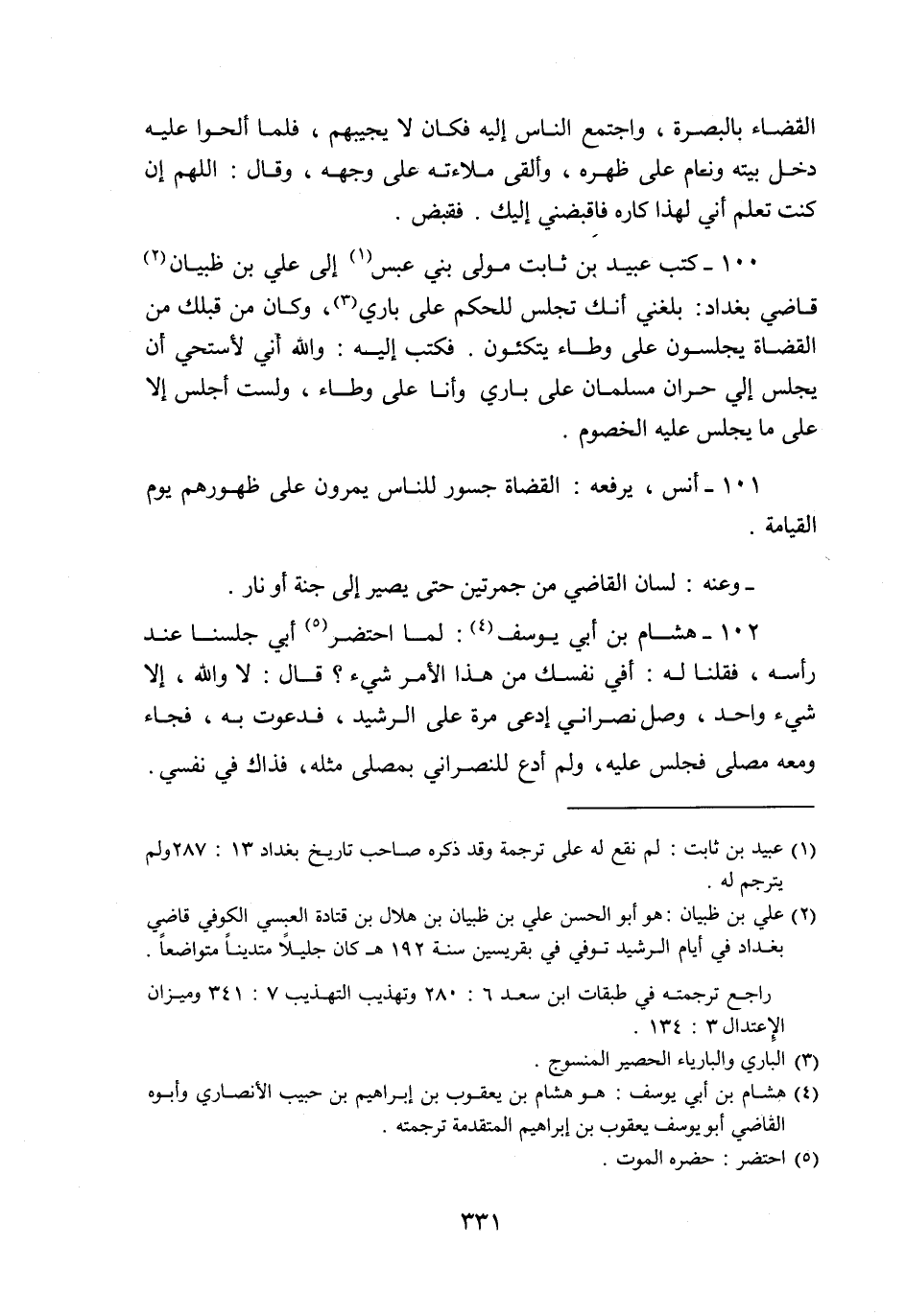 102- هشام بن أبي يوسف «4» : لما احتضر «5» أبي جلسنا عند رأسه، فقلنا له: أفي نفسك من هذا الأمر شيء؟ قال: لا والله، إلا شيء واحد، وصل نصراني إدعى مرة على الرشيد، فدعوت به، فجاء ومعه مصلى فجلس عليه، ولم أدع للنصراني بمصلى مثله، فذاك في نفسي.