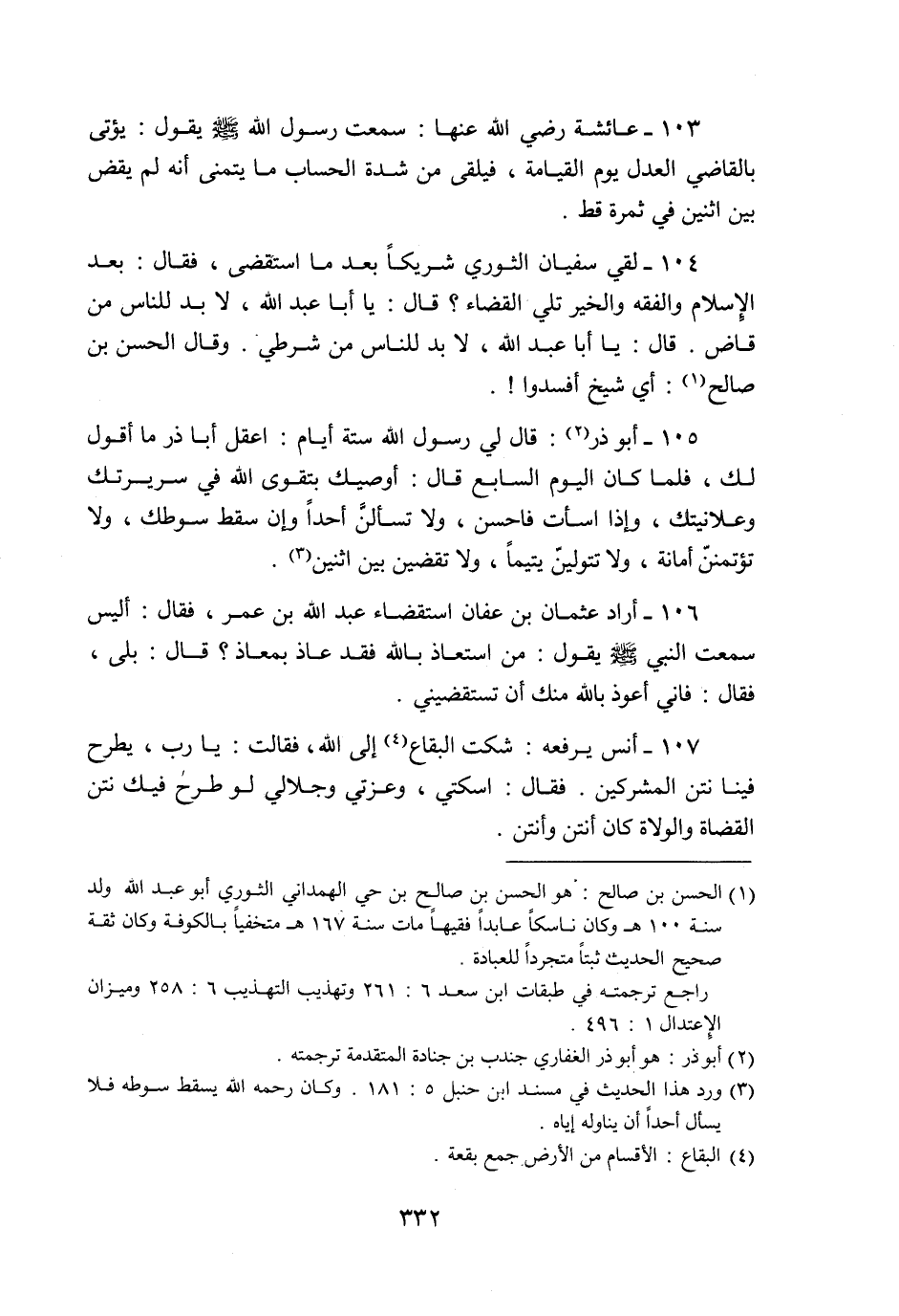 103- عائشة رضي الله عنها: سمعت رسول الله صلّى الله عليه وسلّم يقول: يؤتى بالقاضي العدل يوم القيامة، فيلقى من شدة الحساب ما يتمنى أنه لم يقض بين اثنين في ثمرة قط.