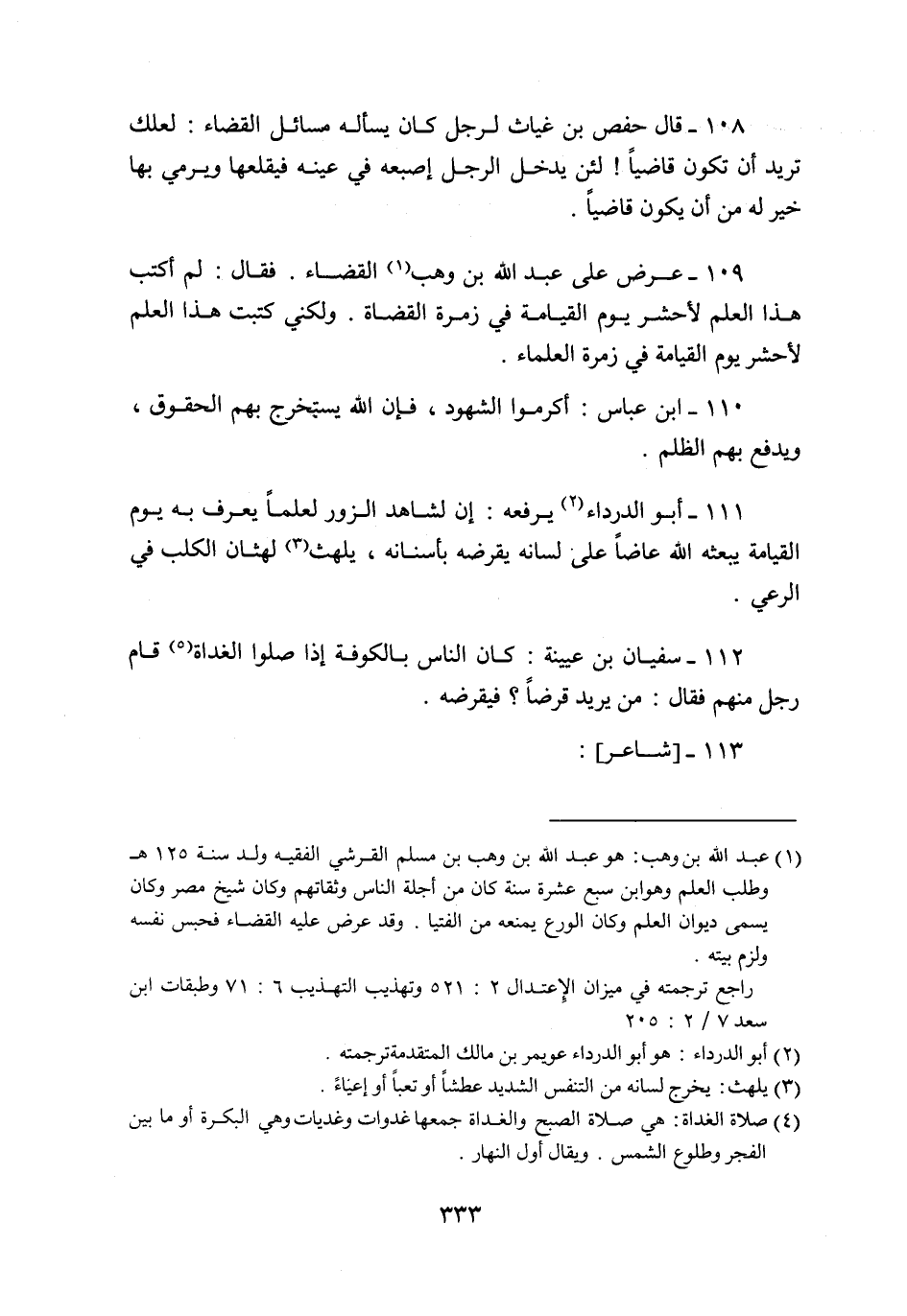 109- عرض على عبد الله بن وهب «1» القضاء. فقال: لم أكتب هذا العلم لأحشر يوم القيامة في زمرة القضاة. ولكني كتبت هذا العلم لأحشر يوم القيامة في زمرة العلماء.
