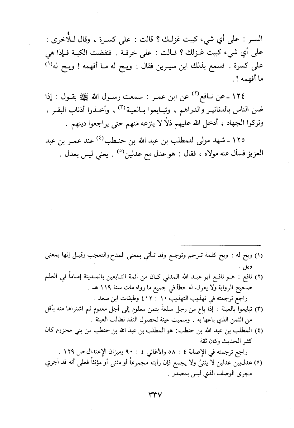 124- عن نافع «2» عن ابن عمر: سمعت رسول الله صلّى الله عليه وسلّم يقول: إذا ضن الناس بالدنانير والدراهم، وتبايعوا بالعينة «3» ، وأخذوا أذناب البقر، وتركوا الجهاد، أدخل الله عليهم ذلا لا ينزعه منهم حتى يراجعوا دينهم.