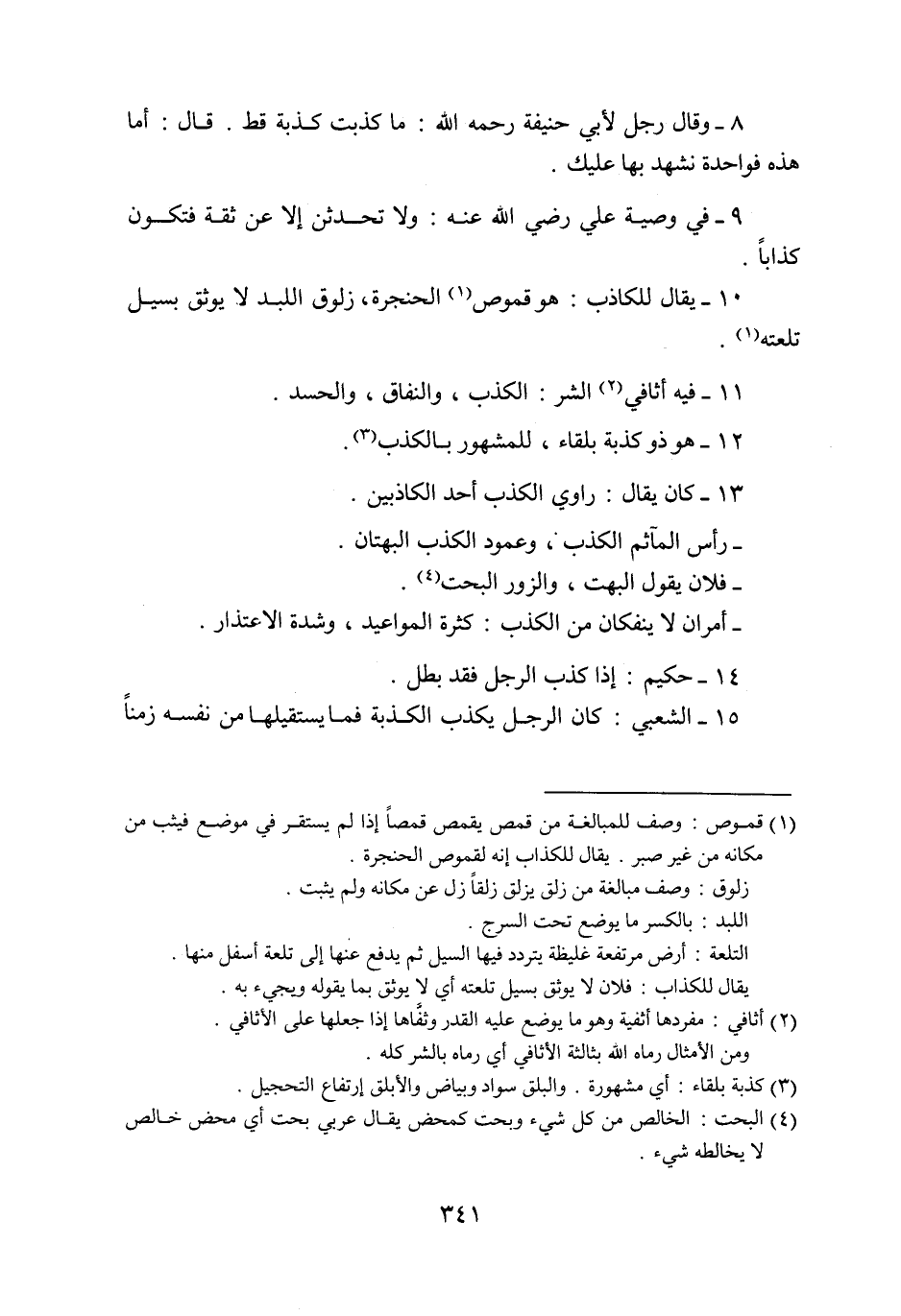10- يقال للكاذب: هو قموص «1» الحنجرة، زلوق اللبد لا يوثق بسيل تلعته «2» .