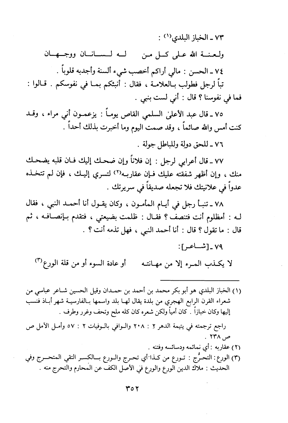 78- تنبأ رجل في أيام المأمون، وكان يقول أنا أحمد النبي، فقال له: أمظلوم أنت فتنصف؟ فقال: ظلمت بضيعتي، فتقدم بإنصافه، ثم قال: ما تقول؟ قال: أنا أحمد النبي، فهل تذمه أنت؟.