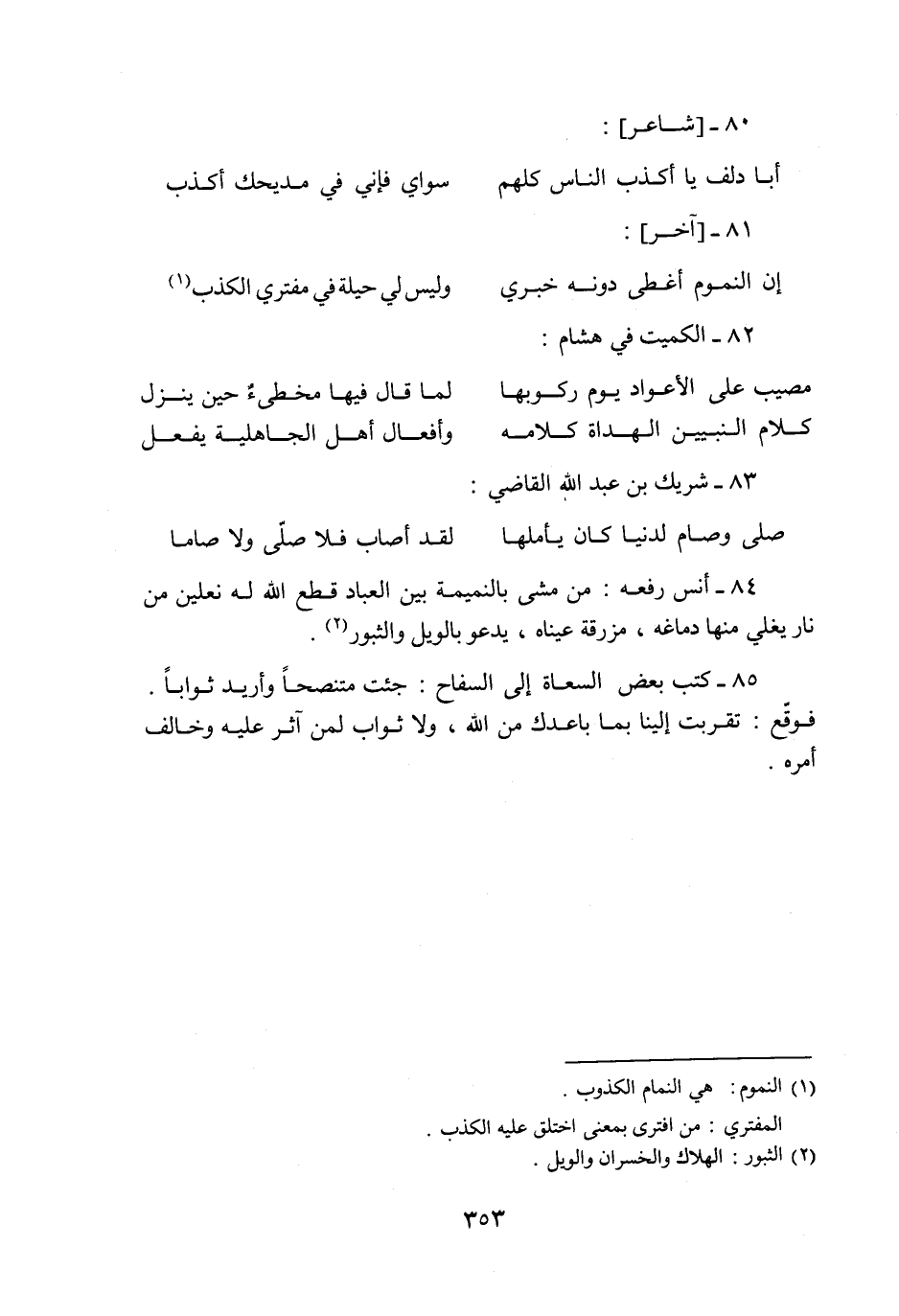 84- أنس رفعه: من مشى بالنميمة بين العباد قطع الله له نعلين من نار يغلي منها دماغه، مزرقة عيناه، يدعو بالويل والثبور «2» .