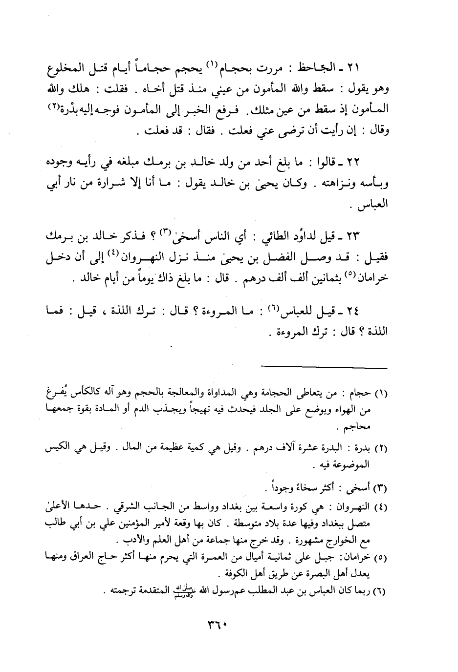 21- الجاحظ: مررت بحجام «1» يحجم حجاما أيام قتل المخلوع وهو يقول: سقط والله المأمون من عيني منذ قتل أخاه. فقلت: هلك والله المأمون إذ سقط من عين مثلك. فرفع الخبر إلى المأمون فوجه إليه بدرة «2» وقال: إن رأيت أن ترضى عني فعلت. فقال: قد فعلت.