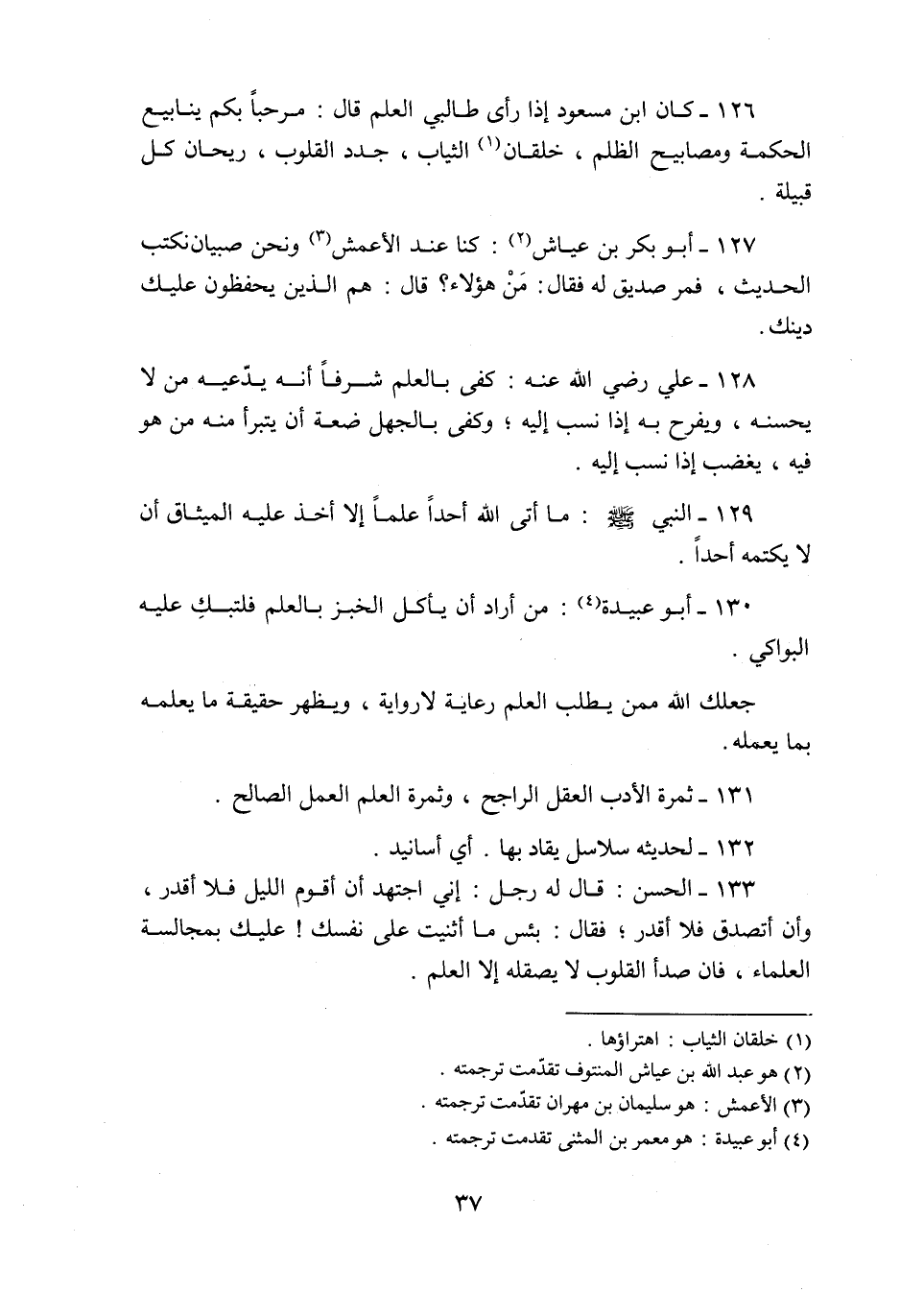 127- أبو بكر بن عياش «2» : كنا عند الأعمش «3» ونحن صبيان نكتب الحديث، فمر صديق له فقال: من هؤلاء؟ قال: هم الذين يحفظون عليك دينك.