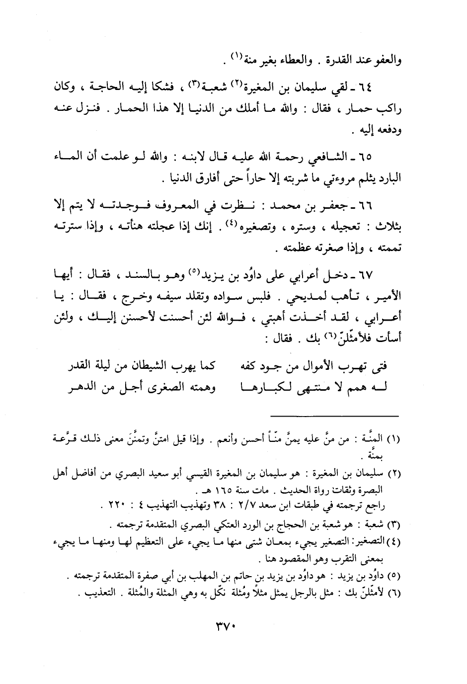 64- لقي سليمان بن المغيرة «2» شعبة «3» ، فشكا إليه الحاجة، وكان راكب حمار، فقال: والله ما أملك من الدنيا إلا هذا الحمار. فنزل عنه ودفعه إليه.
