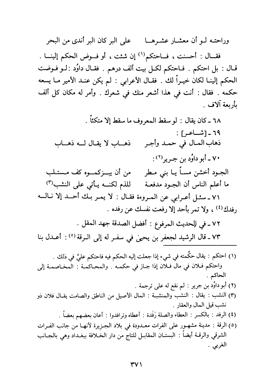 71- سئل أعرابي عن المروءة فقال: لا يمر بك أحد إلا ناله رفدك «4» ، ولا تمر بأحد إلا رفعت نفسك عن رفده.