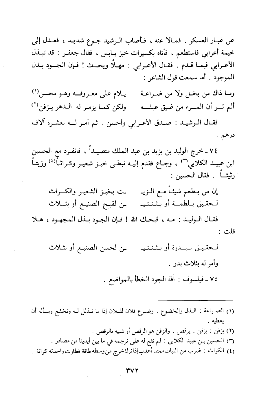 74- خرج الوليد بن يزيد بن عبد الملك متصيدا، فانفرد مع الحسين ابن عبيد الكلابي «3» ، وجاع فقدم إليه نبطى خبز شعير وكراثا «4» وزيتا رثيثا. فقال الحسين: