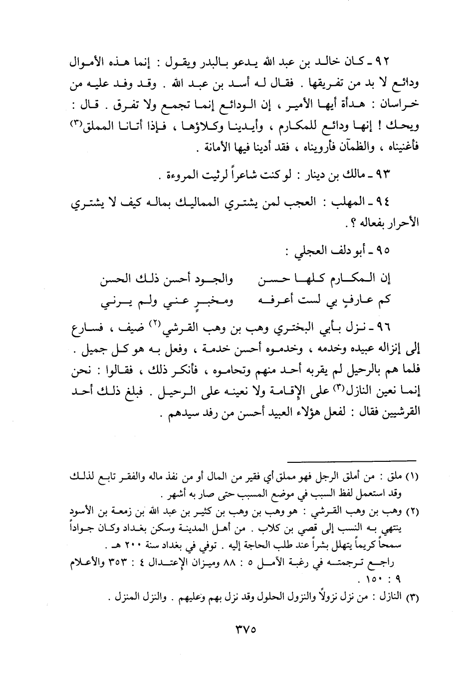 92- كان خالد بن عبد الله يدعو بالبدر ويقول: إنما هذه الأموال ودائع لا بد من تفريقها. فقال له أسد بن عبد الله. وقد وفد عليه من خراسان: هدأة أيها الأمير، إن الودائع إنما تجمع ولا تفرق. قال: