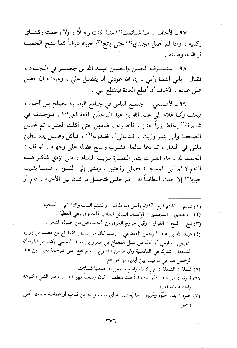 97- الأحنف: ما شاتمت «1» منذ كنت رجلا، ولا زحمت ركبتاي ركبتيه، وإذا لم أصل مجتدي «2» حتى ينتح «3» جبينه عرقا كما ينتح الحميت فو الله ما وصلته.