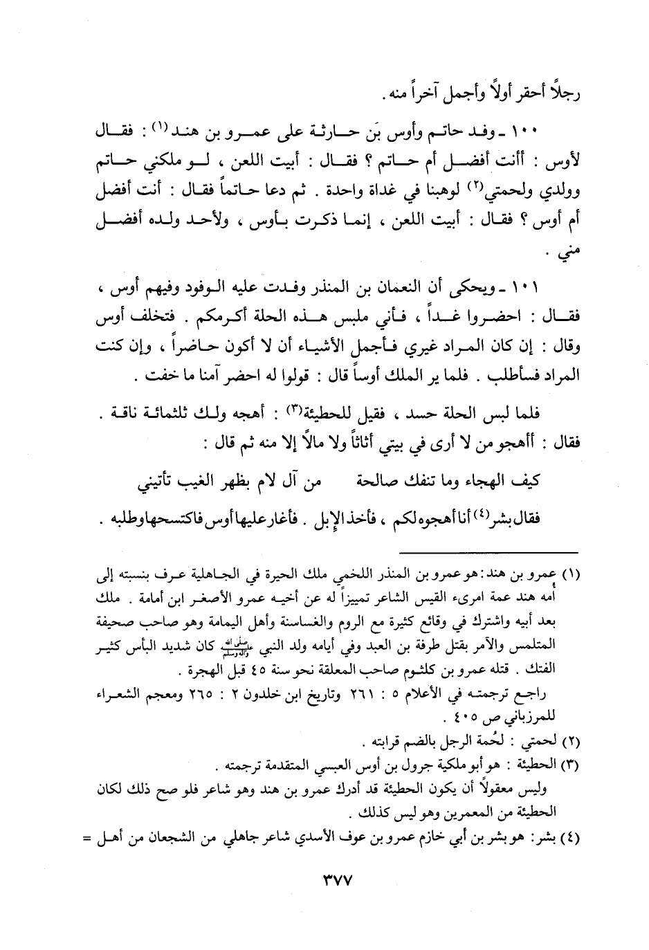 101- ويحكى أن النعمان بن المنذر وفدت عليه الوفود وفيهم أوس، فقال: احضروا غدا، فأني ملبس هذه الحلة أكرمكم. فتخلف أوس وقال: إن كان المراد غيري فأجمل الأشياء أن لا أكون حاضرا، وإن كنت المراد فسأطلب. فلما ير الملك أوسا قال: قولوا له احضر آمنا ما خفت.