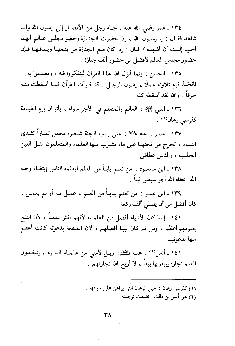 134- عمر رضي الله عنه: جاء رجل من الأنصار إلى رسول الله وأنا شاهد فقال: يا رسول الله، إذا حضرت الجنازة وحضر مجلس عالم أيهما أحب إليك أن أشهده؟ قال: إذا كان مع الجنازة من يتبعها ويدفنها فإن حضور مجلس العالم لأفضل من حضور ألف جنازة.