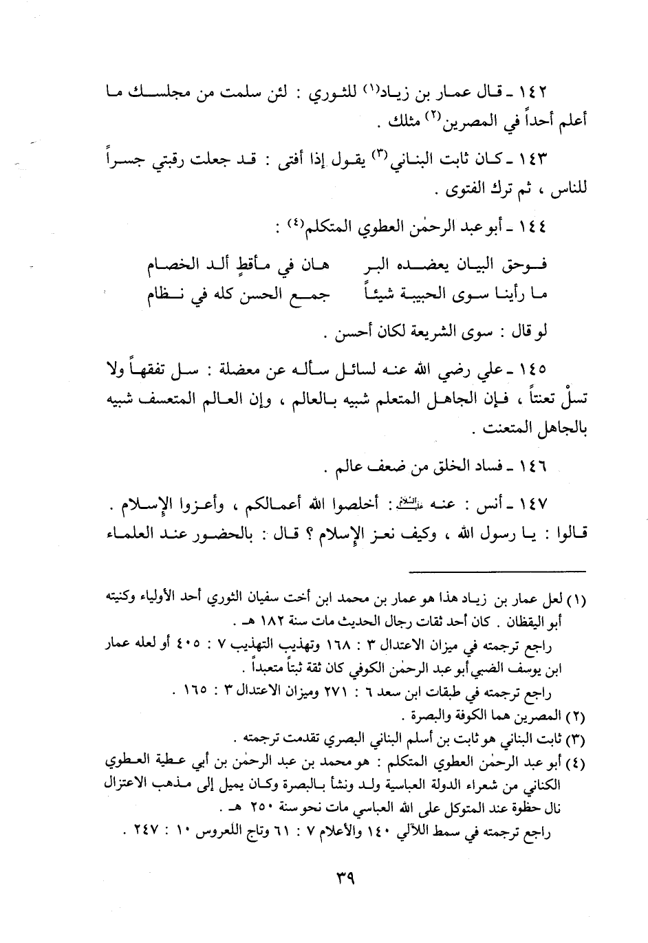 143- كان ثابت البناني «3» يقول إذا أفتى: قد جعلت رقبتي جسرا للناس، ثم ترك الفتوى.