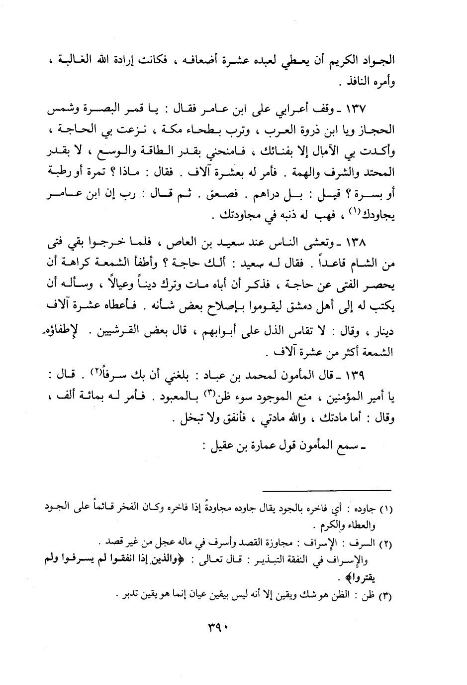 يا أمير المؤمنين، منع الموجود سوء ظن «3» بالمعبود. فأمر له بمائة ألف، وقال: أما مادتك، والله مادتي، فأنفق ولا تبخل.