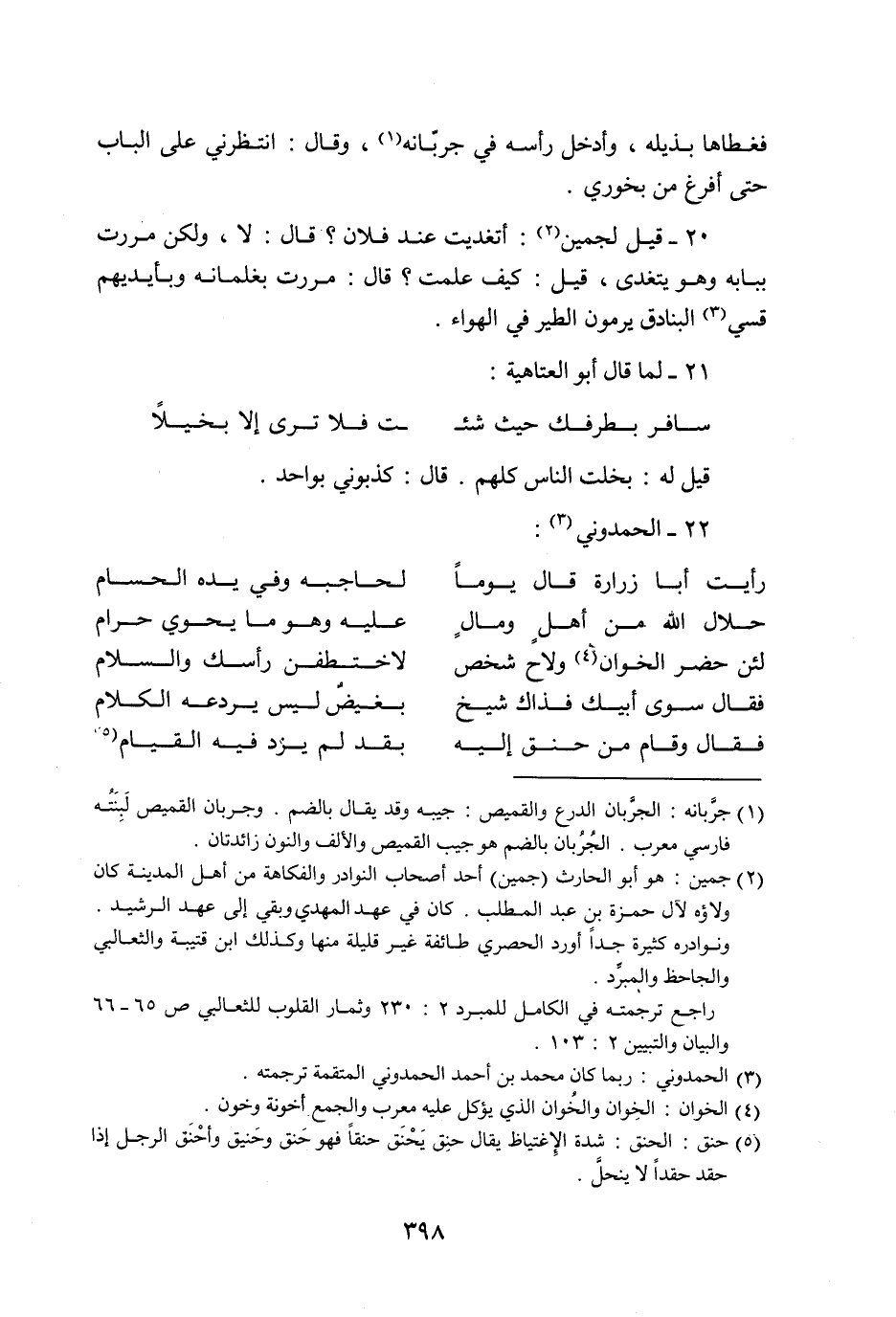 20- قيل لجمين «2» : أتغديت عند فلان؟ قال: لا، ولكن مررت ببابه وهو يتغدى، قيل: كيف علمت؟ قال: مررت بغلمانه وبأيديهم قسي (3) البنادق يرمون الطير في الهواء.