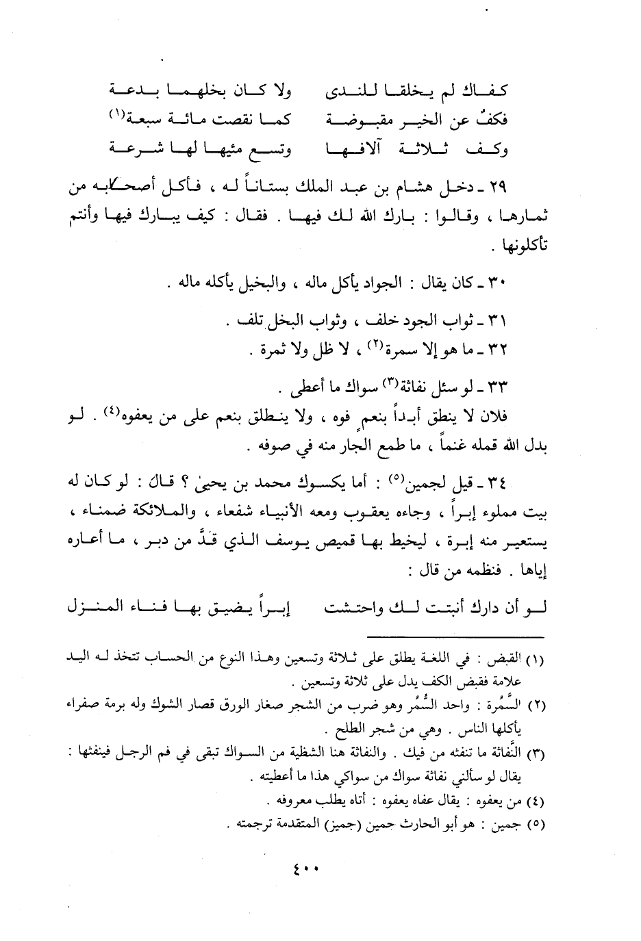 34- قيل لجمين «5» : أما يكسوك محمد بن يحيى؟ قال: لو كان له بيت مملوء إبرا، وجاءه يعقوب ومعه الأنبياء شفعاء، والملائكة ضمناء، يستعير منه إبرة، ليخيط بها قميص يوسف الذي قدّ من دبر، ما أعاره إياها. فنظمه من قال: