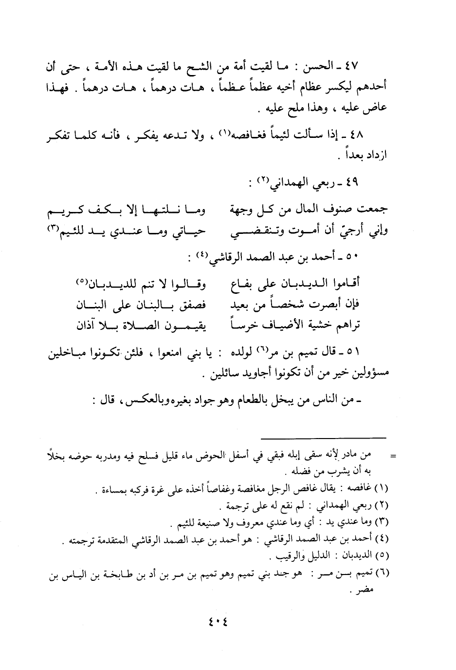 51- قال تميم بن مر «6» لولده: يا بني امنعوا، فلئن تكونوا مباخلين مسؤولين خير من أن تكونوا أجاويد سائلين.