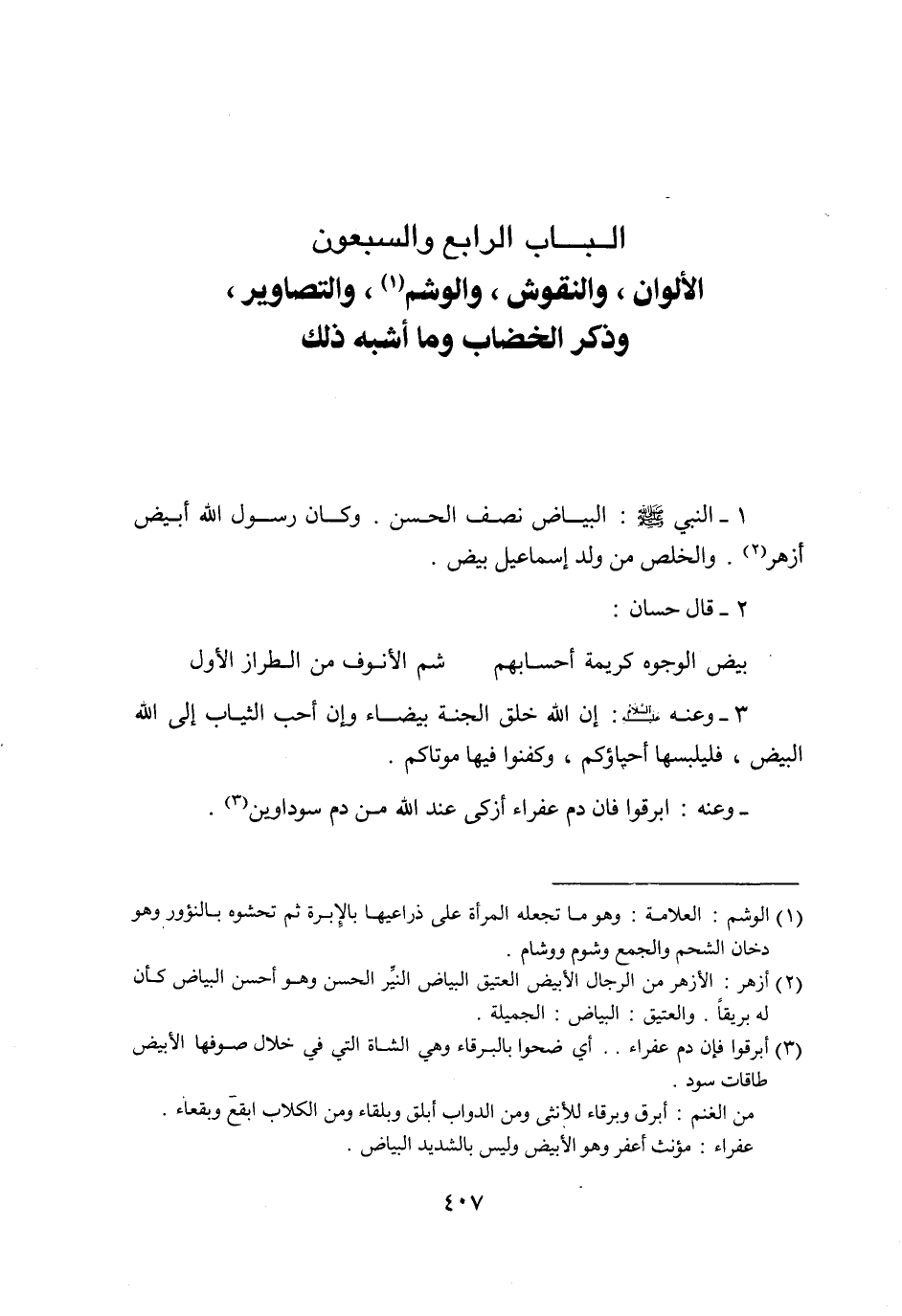 الباب الرابع والسبعون الألوان، والنقوش، والوشم «1» ، والتصاوير، وذكر الخضاب وما أشبه ذلك