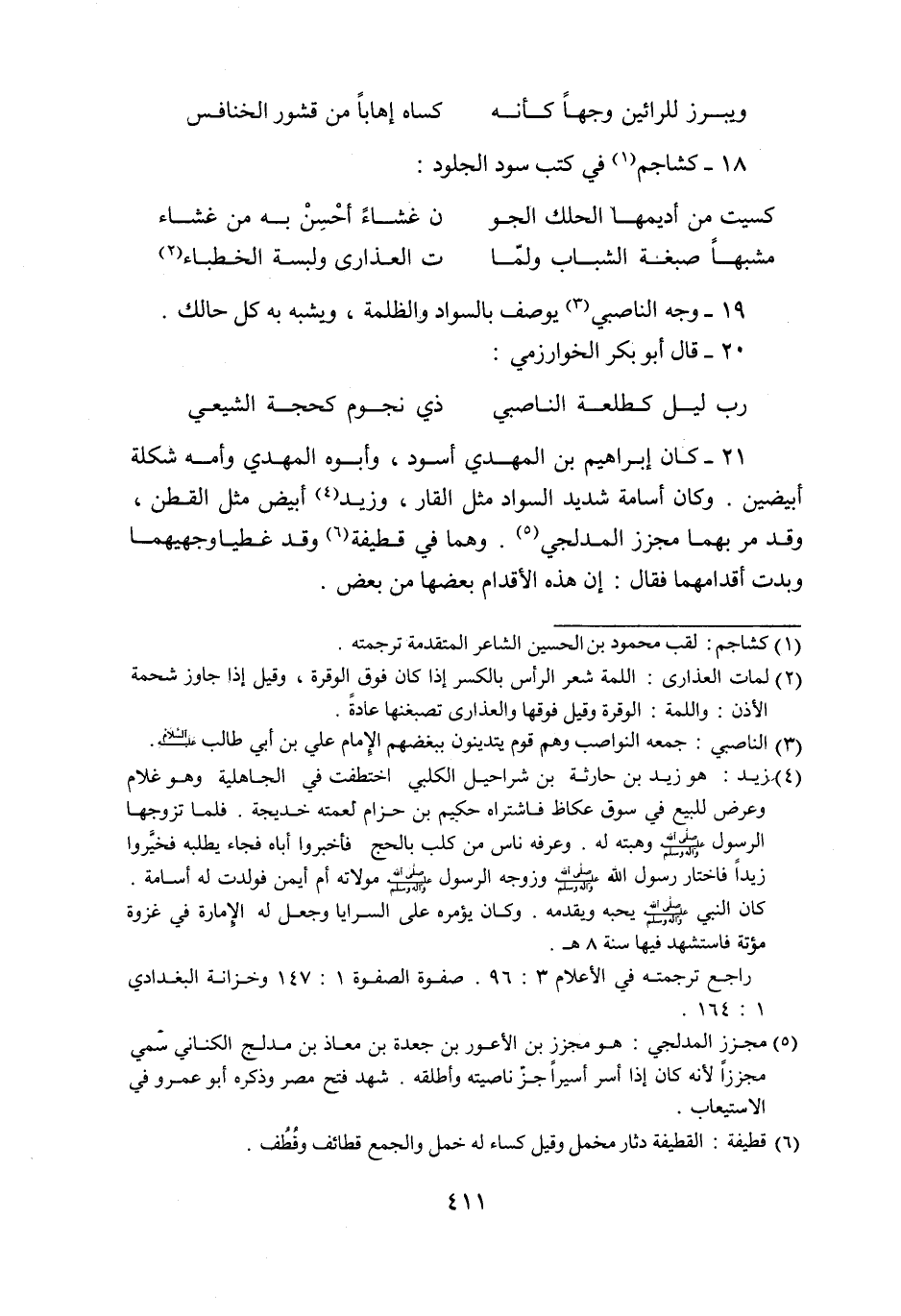 21- كان إبراهيم بن المهدي أسود، وأبوه المهدي وأمه شكلة أبيضين. وكان أسامة شديد السواد مثل القار، وزيد «4» أبيض مثل القطن، وقد مر بهما مجزز المدلجي «5» . وهما في قطيفة «6» وقد غطيا وجهيهما وبدت أقدامهما فقال: إن هذه الأقدام بعضها من بعض.