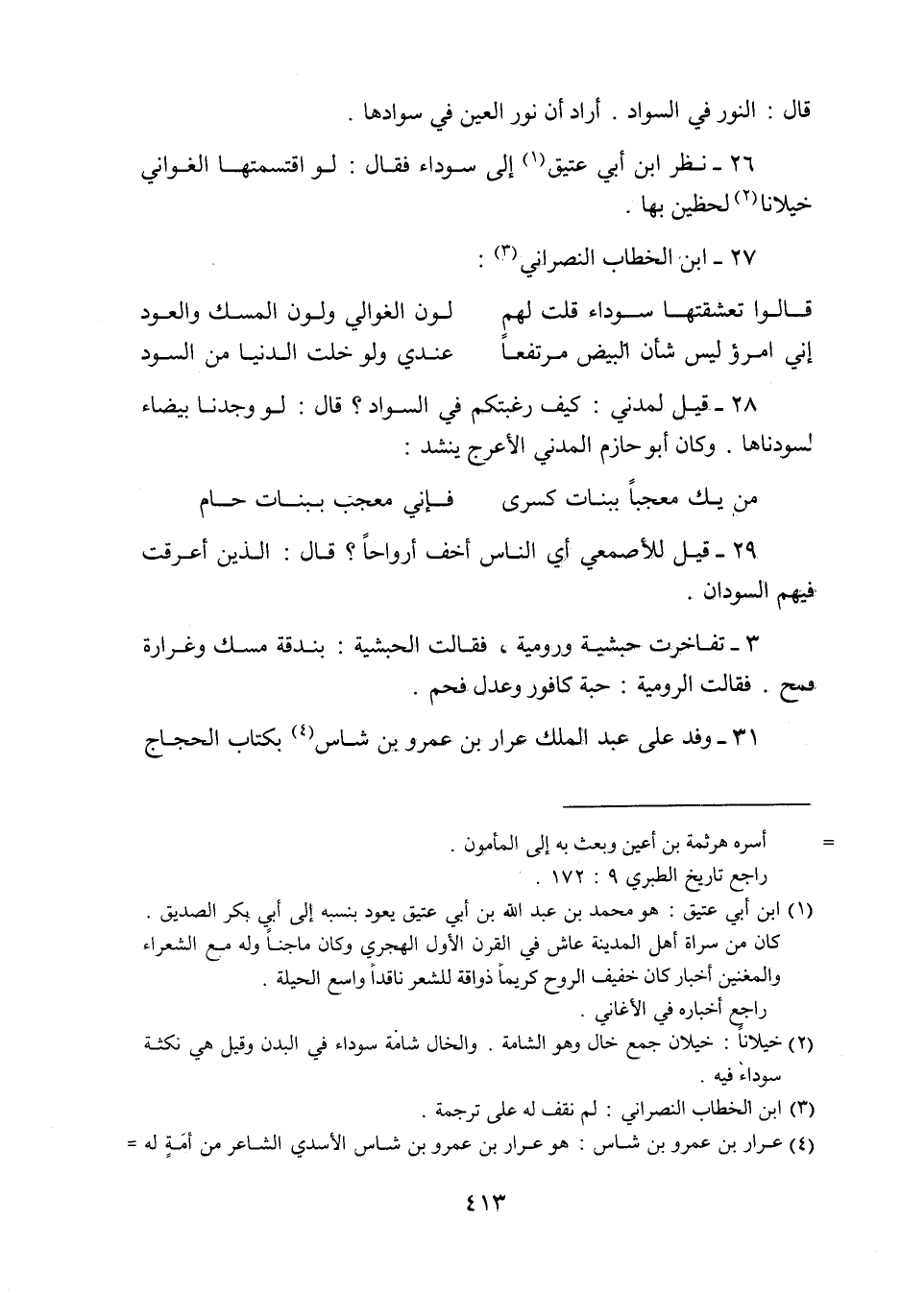 28- قيل لمدني: كيف رغبتكم في السواد؟ قال: لو وجدنا بيضاء لسودناها. وكان أبو حازم المدني الأعرج ينشد: