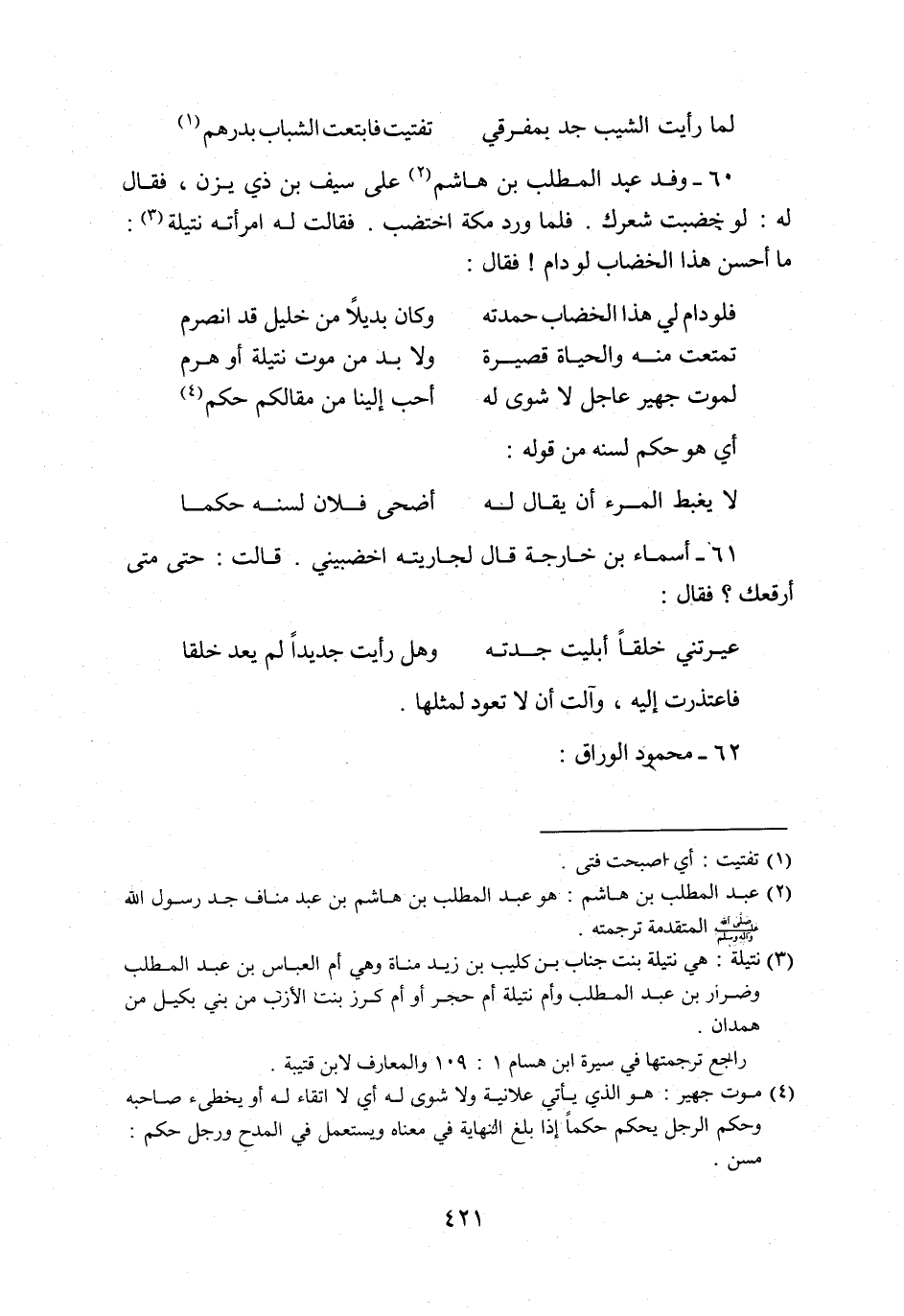 60- وفد عبد المطلب بن هاشم «2» على سيف بن ذي يزن، فقال له: لو خضبت شعرك. فلما ورد مكة اختضب. فقالت له امرأته نتيلة «3» :